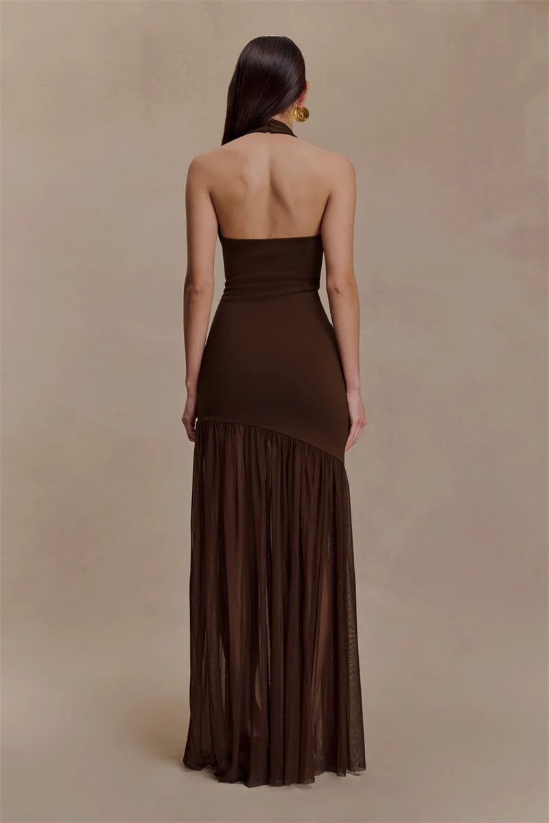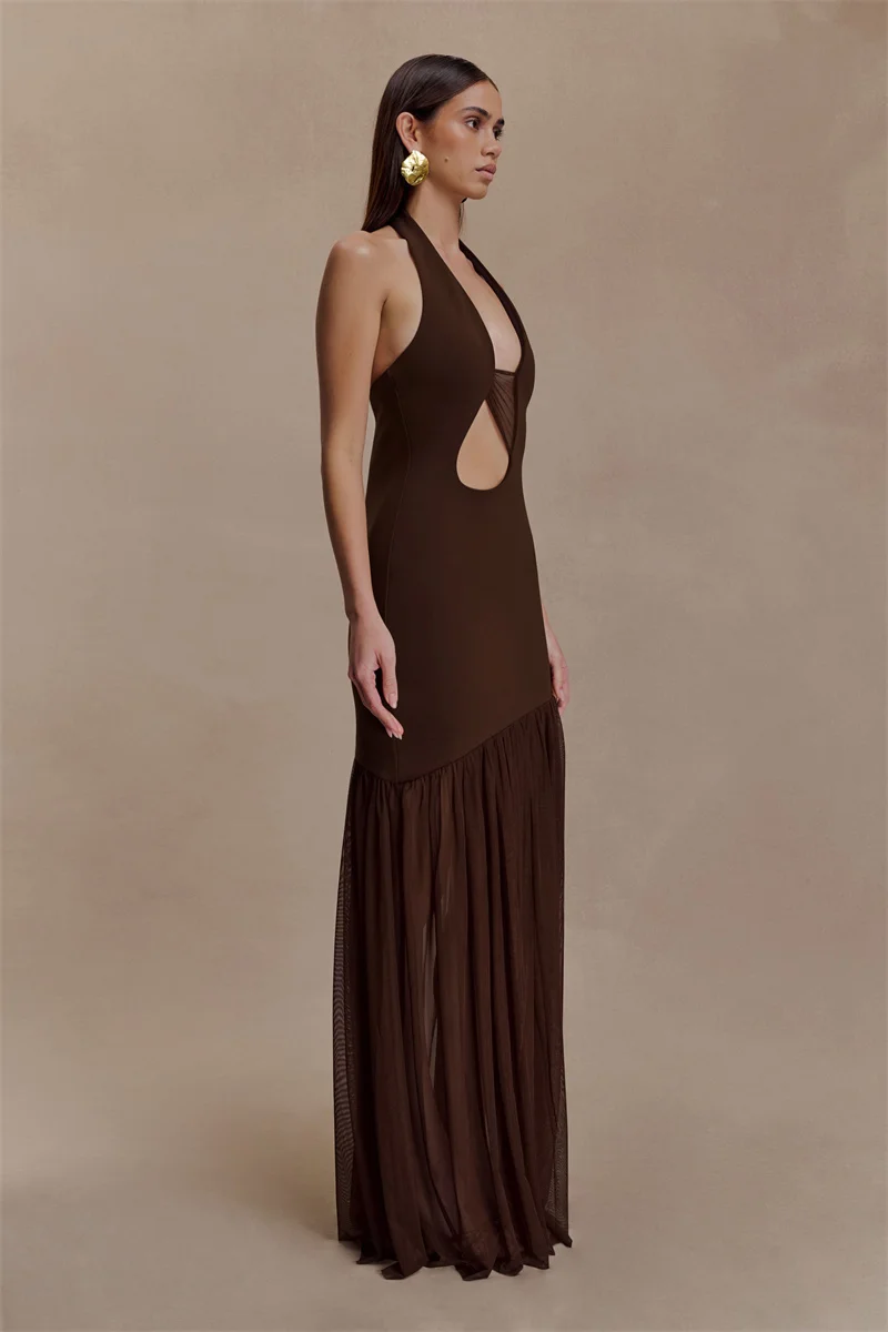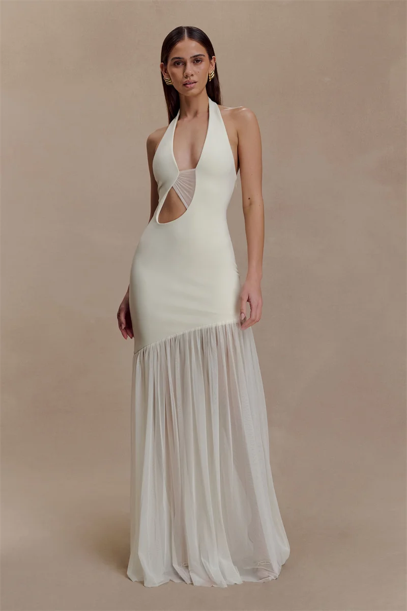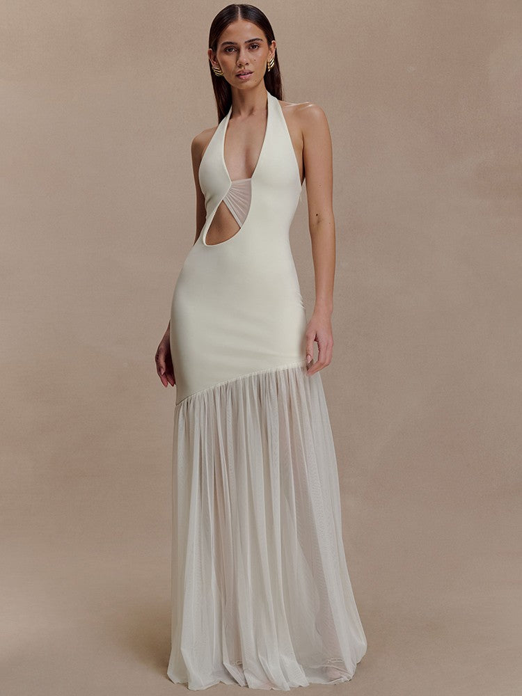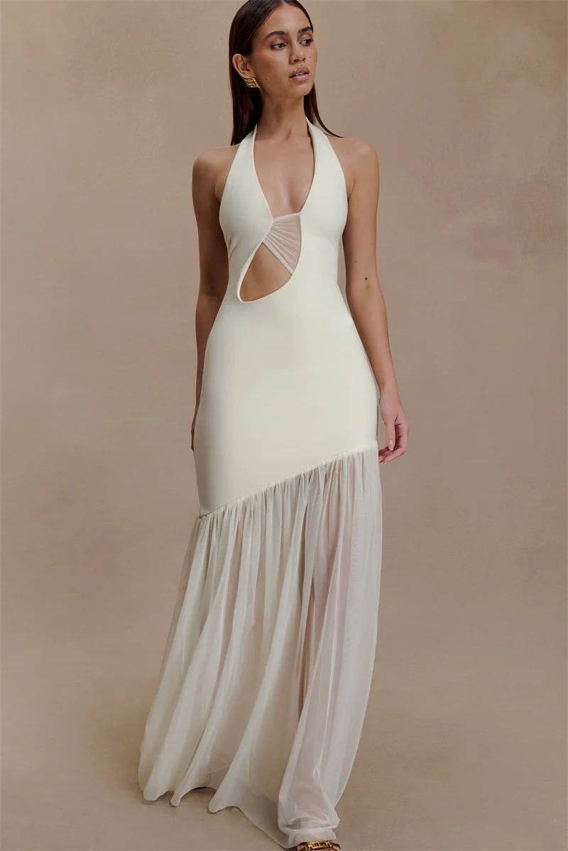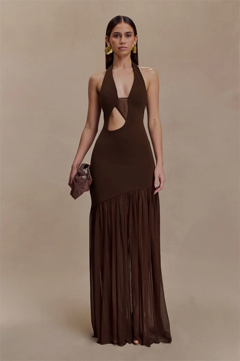 Mozision Hollow Out Halter Backless Sexy Maxi Dress Women Gown Elegant Patchwork V Neck Sleeveless Bodycon Club Party Long Dress