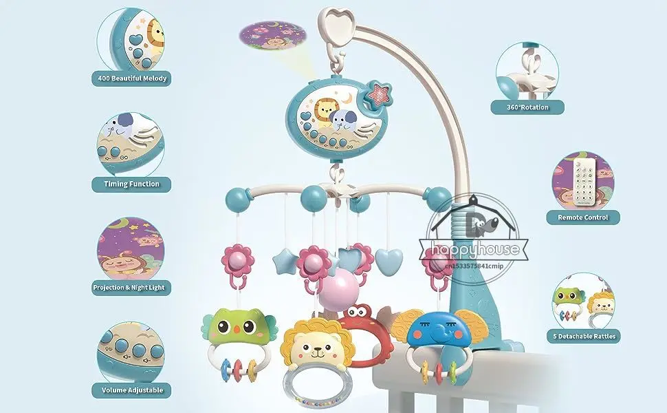 • ?Five Detachable Rattles?The five detachable hanging cute and cartoon animal toys improve cognition. 360° rotating hanging rattles with music and light to attract the baby's attention and exercise their vision.