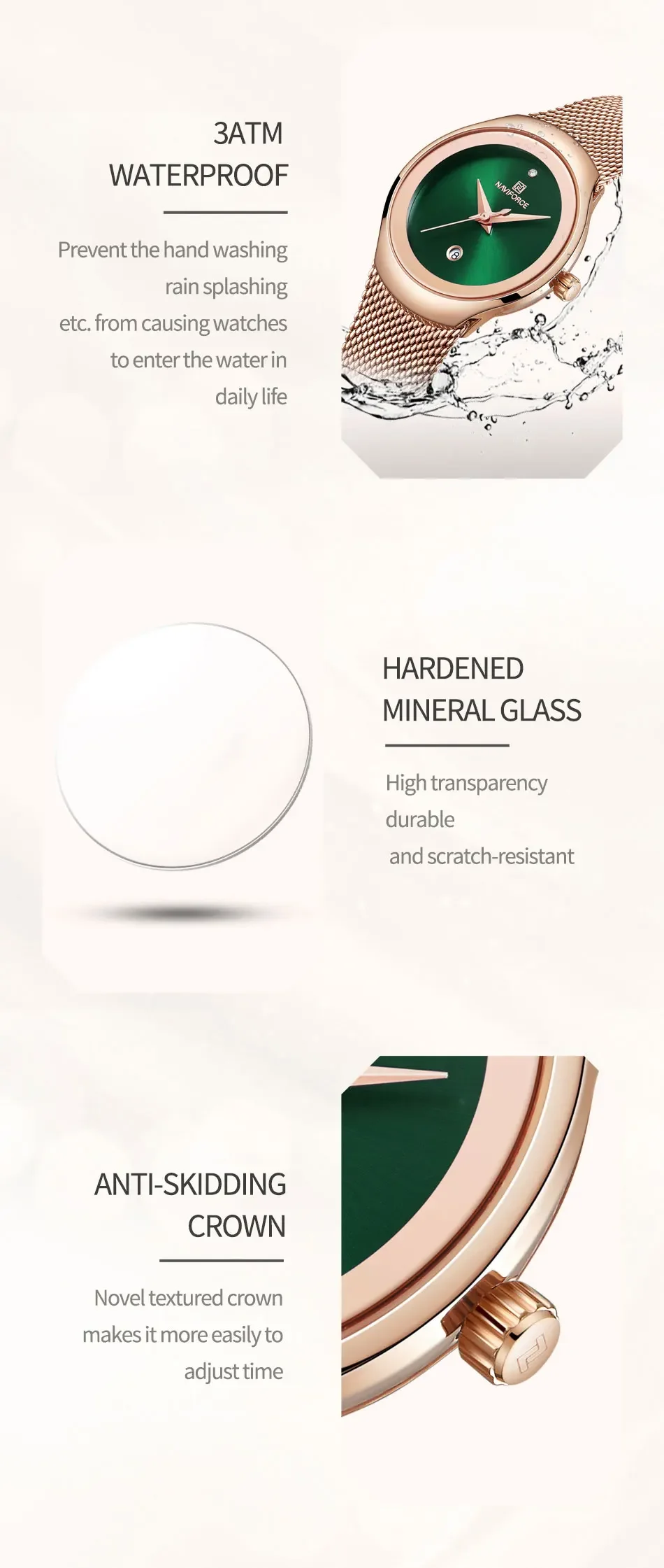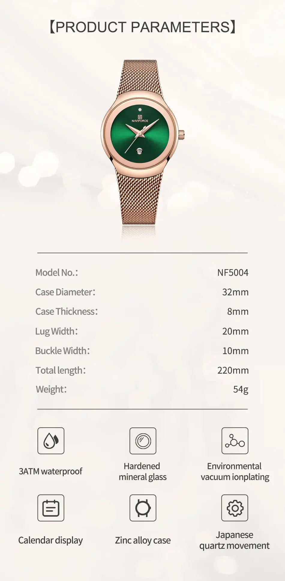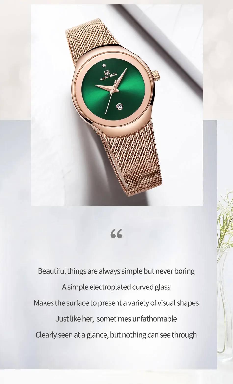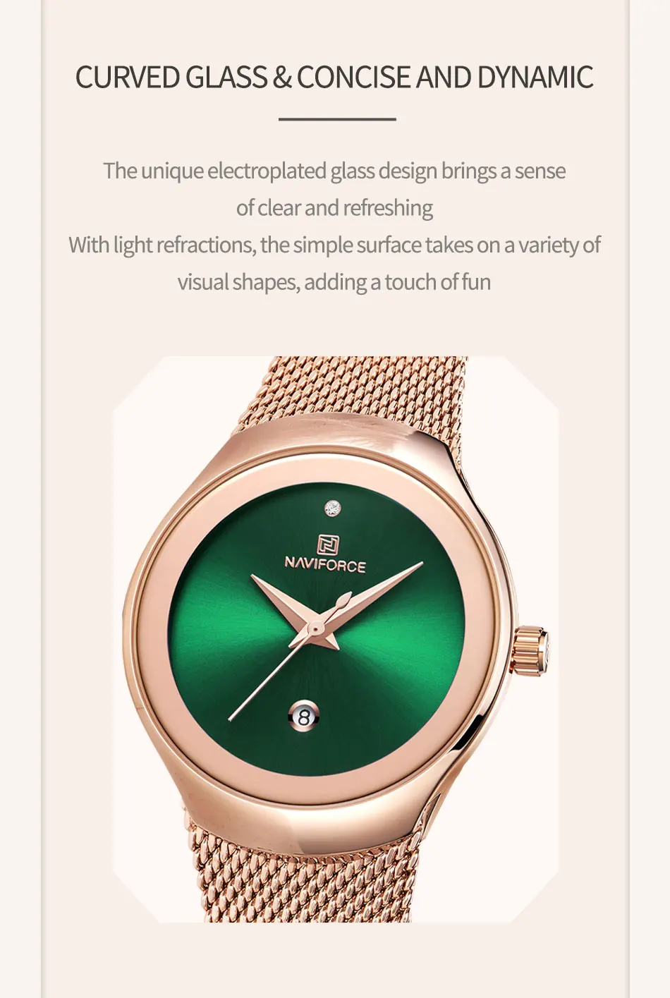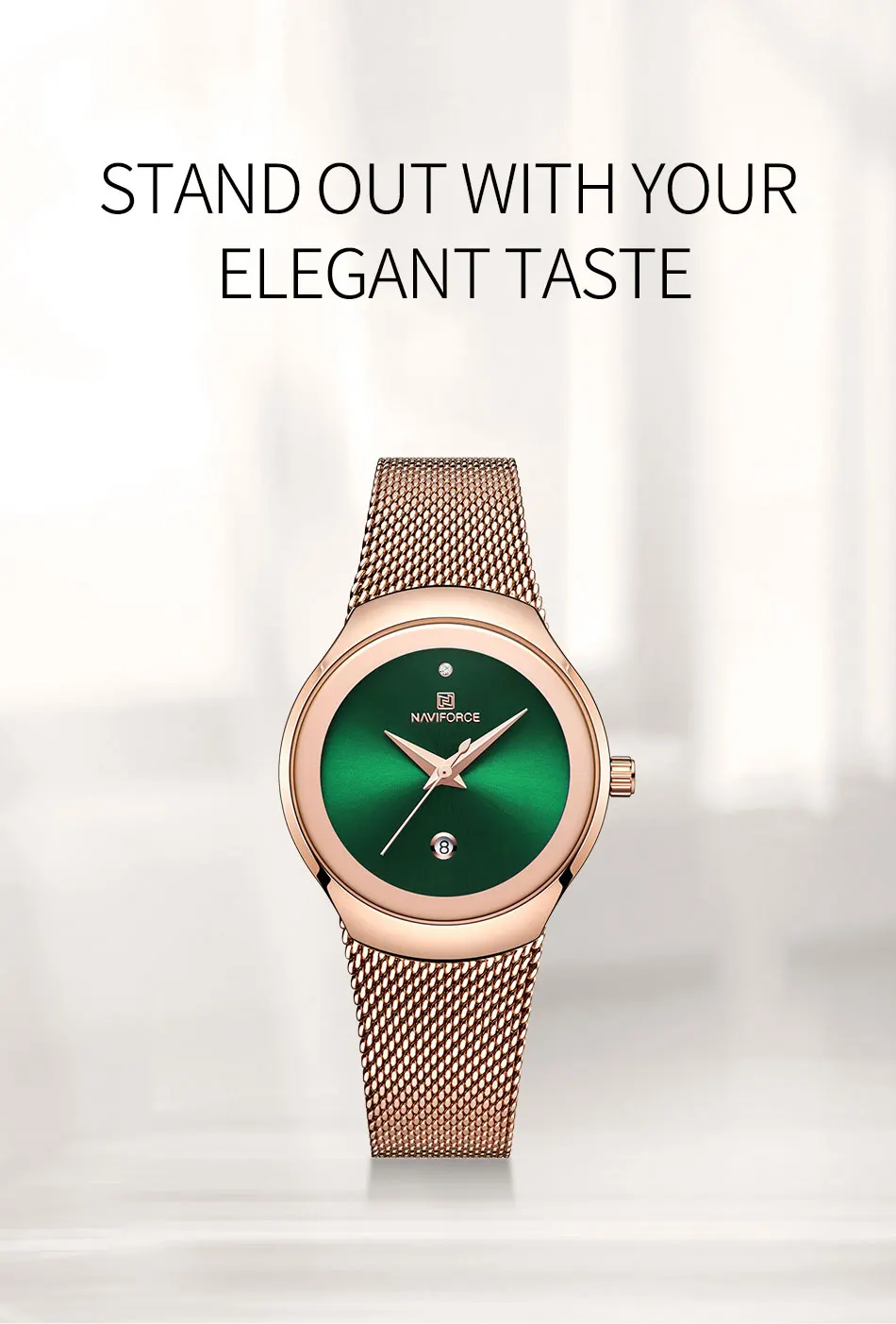 NAVIFORCE Luxury Green Analog Date Quartz Fashion Ladies Watches Mesh Steel Strap Waterproof Business Women Wristwatch Clocks