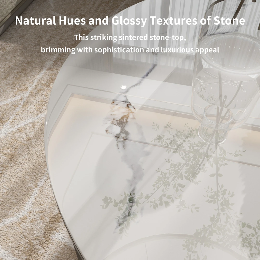 This coffee table set brings a modern-inspired aesthetic to your living room, elevating the ambiance with its sleek design and luxurious materials. It boasts a jade-white sintered stone-top that emulates natural textures, with a hardness rating of 6 on the Mohs scale. The tabletop offers exceptional resistance to stains, abrasions, scratches, and impacts, ensuring long-lasting durability. Its non-porous nature makes it highly resistant to liquid penetration, while being heat-resistant up to 1200? without cracking—ensuring you can place hot beverages or dishes on the surface without concern. Its low-maintenance design saves you energy.