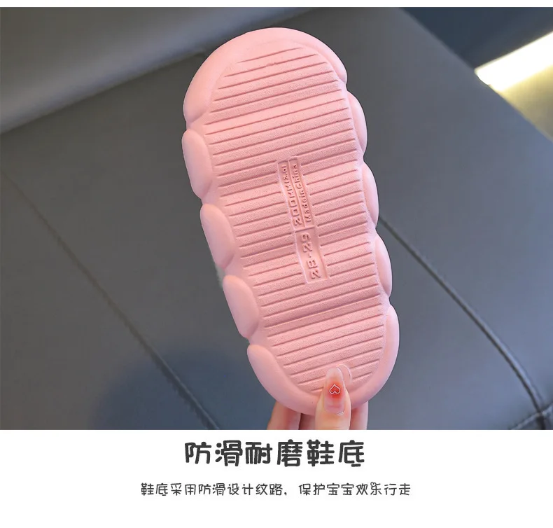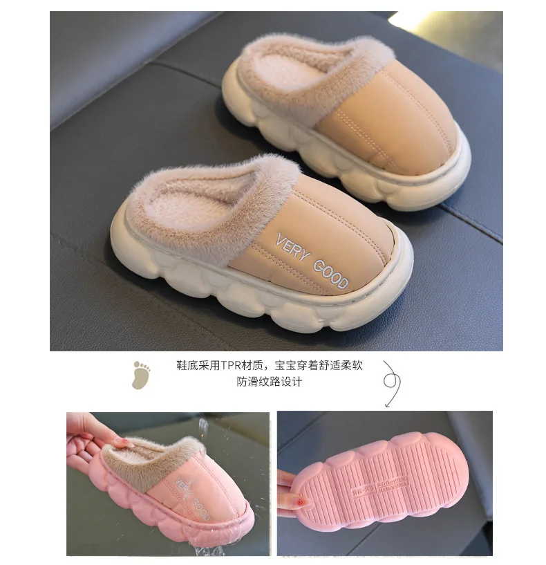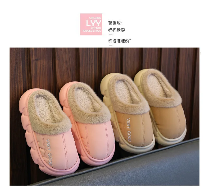 New Children's PU Leather Plush Slippers Soft Sole Non-slip Winter Warm Baby Boys Girls Indoor Home Cotton Shoes