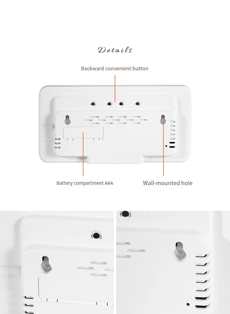 • High-brightness LED display — clearly shows current time, temperature, date, and day of the week with sharp clarity—perfect for easy readability in any lighting condition.