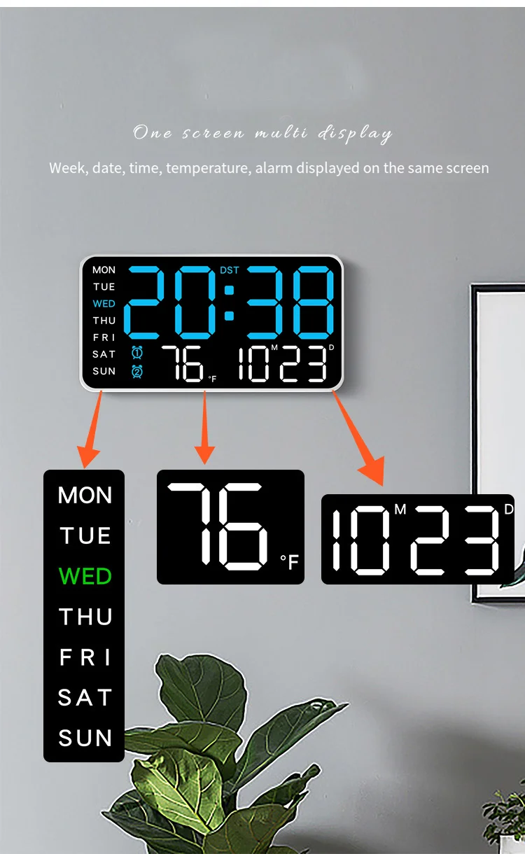 Enhanced your living or workspace with this versatile Digital Wall Clock—designed for convenience, energy efficiency, and modern style. This multifunctional digital clock seamlessly blends into any home, office, or professional environment, offering a sleek, contemporary look combined with advanced features.