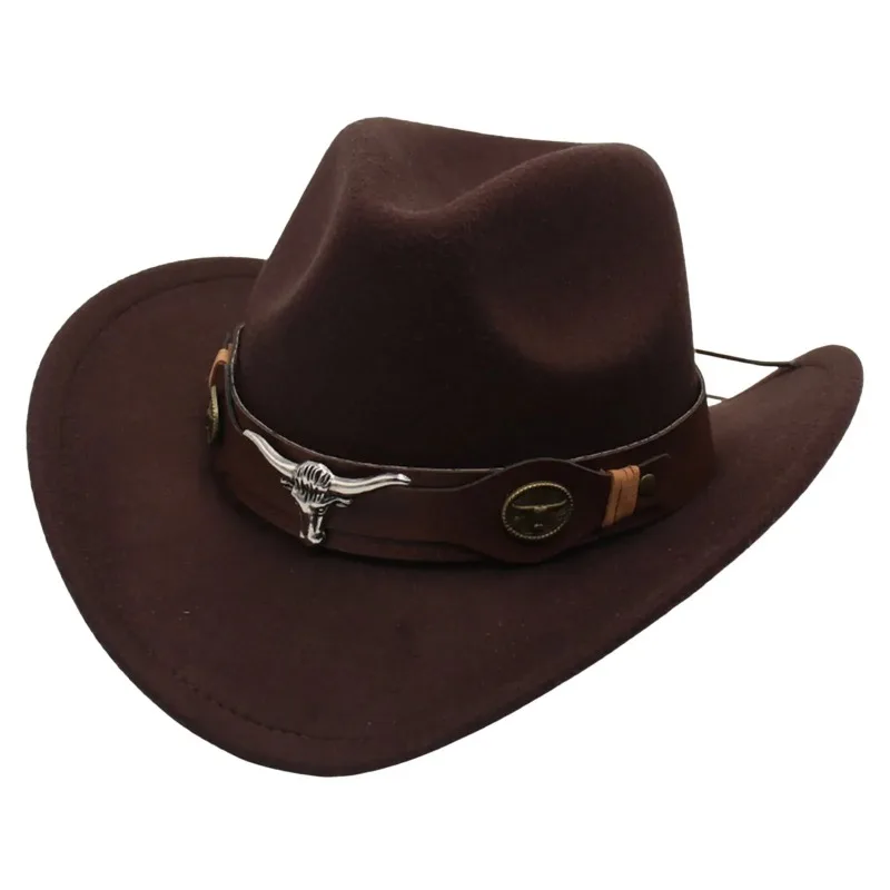 New Felt Western Cowboy Hat Ox Head Accessories Ethnic Style Roll Brim Cowgirl Cap with Cow Band Soft Jazz Fedora Hats Men