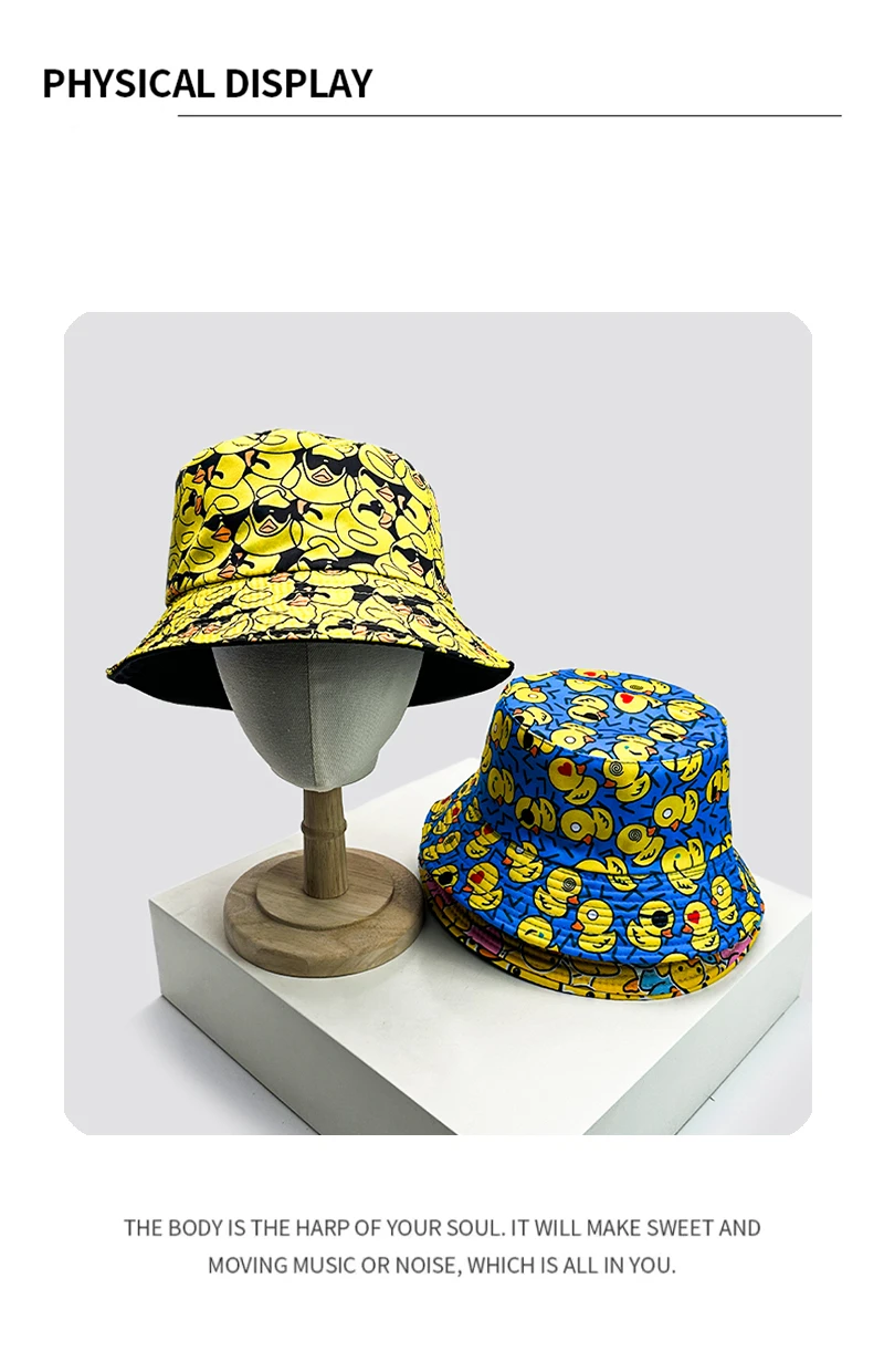 New Unisex Print Yellow Duck Bucket Hats Sunshade Double Sided Wearable Fashion Cute Casual Fisherman Caps Versatile Cartoon ins