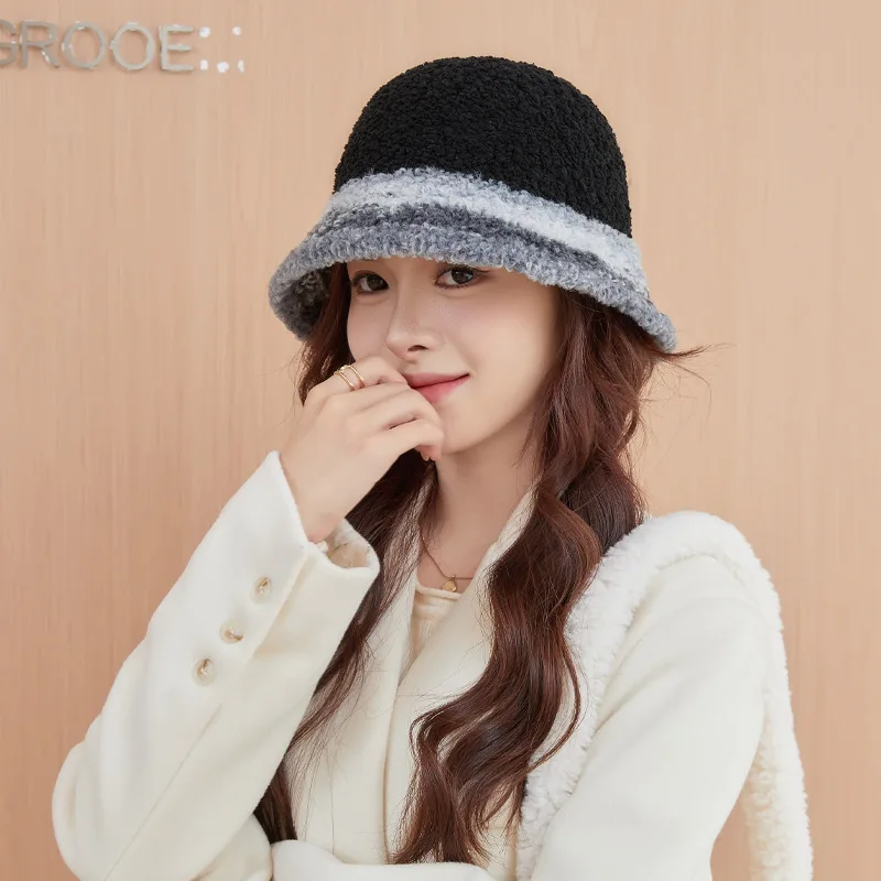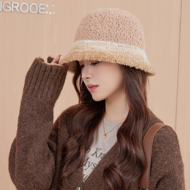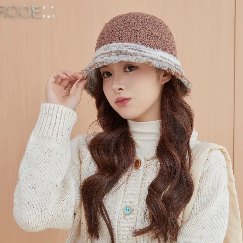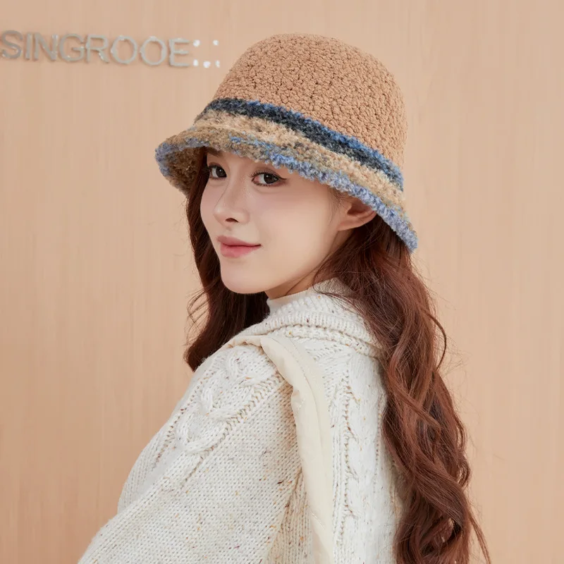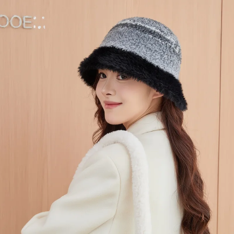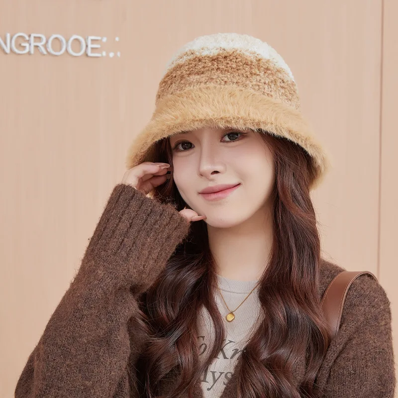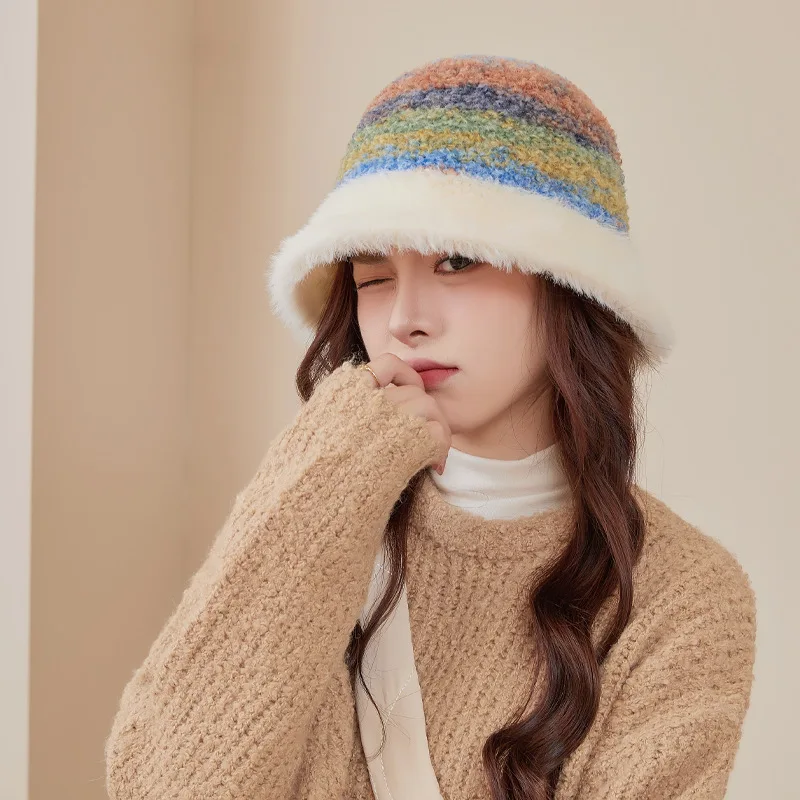 New Warm Luxury Bucket Hat For Women Plush Patchwork Autumn Winter Wool Felt Stripe Large Bucket Hat Colorful Faux Fur Hat Cap