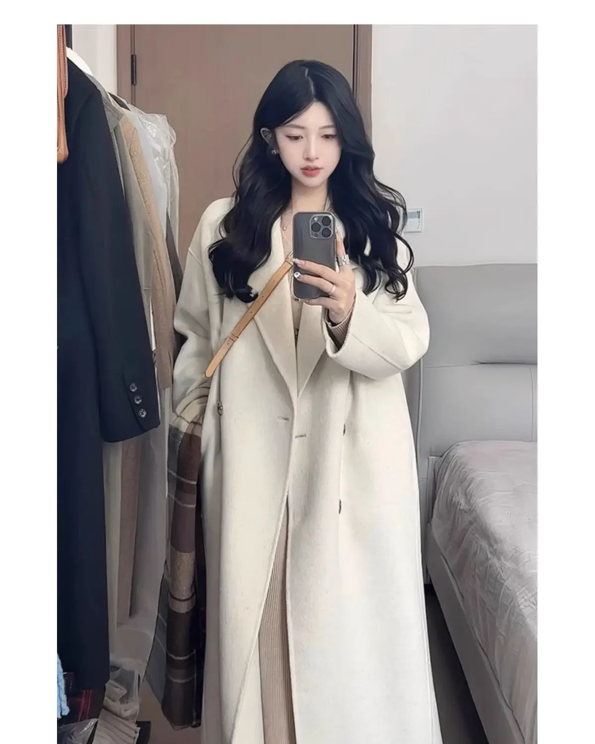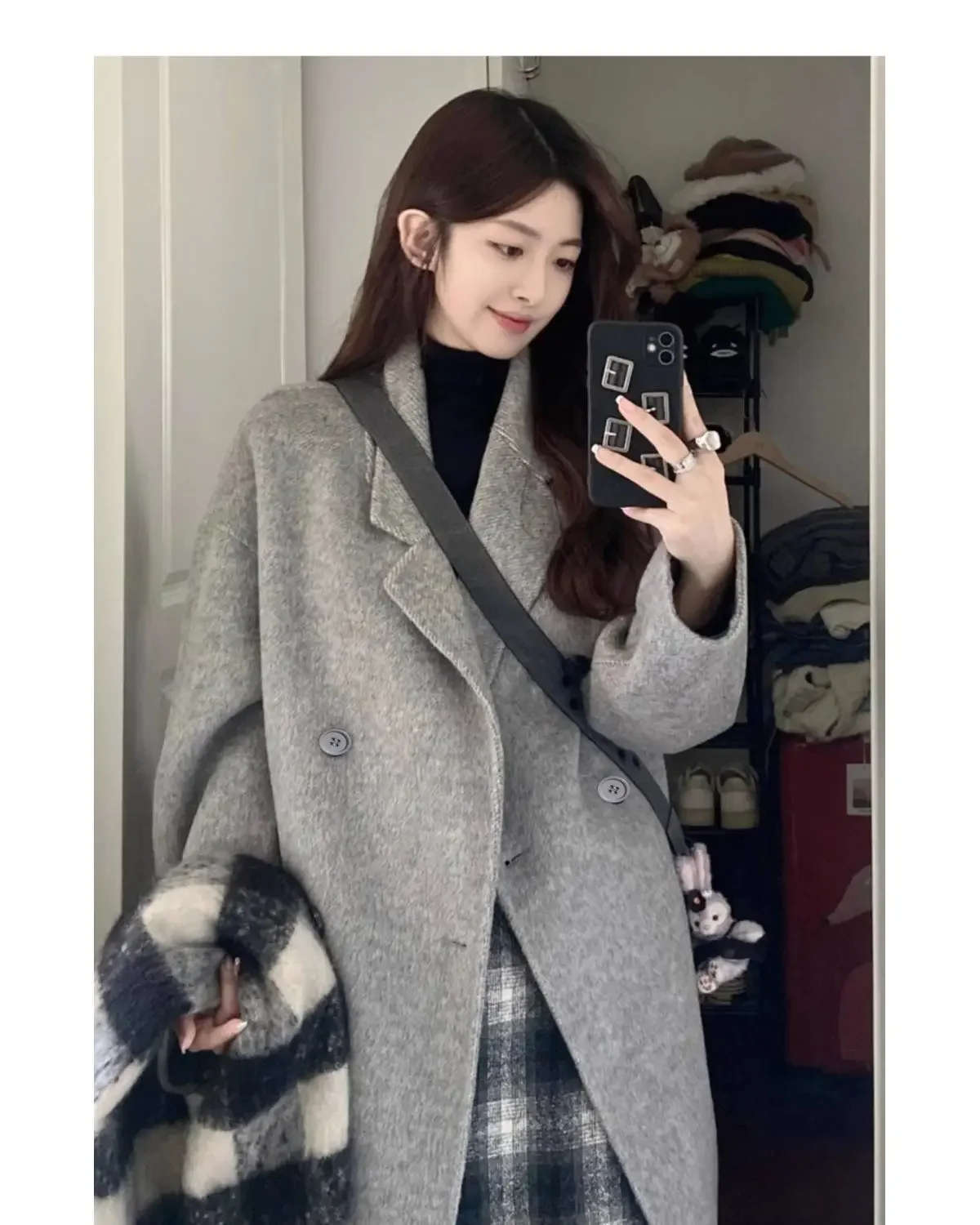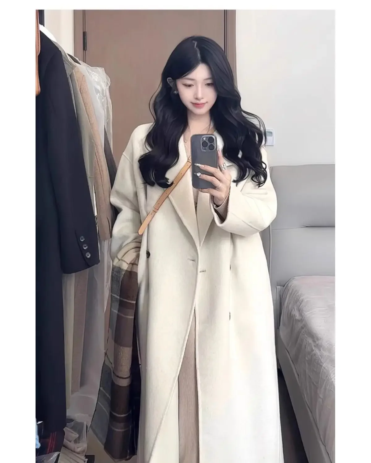 Oatmeal Color Woolen Coat Women's Loose Mid-Length Korean Style Autumn Winter New Arrival Fashion Outerwear Pure Color Full Slee