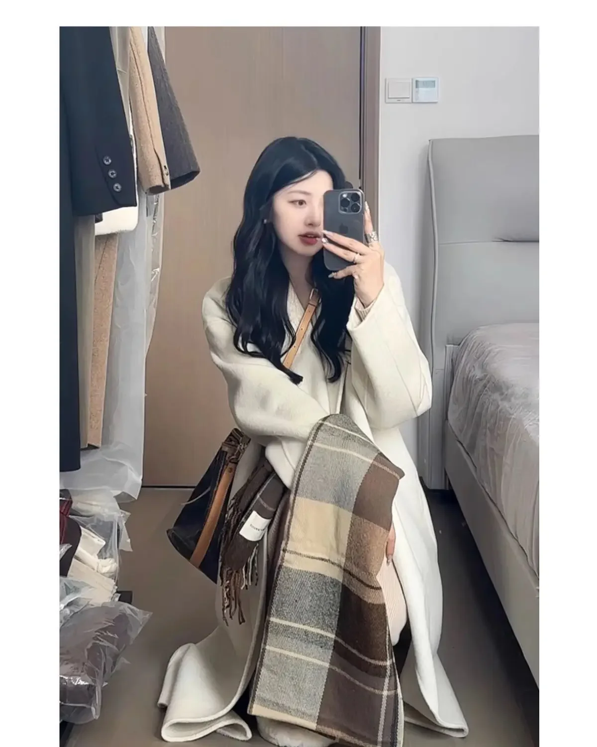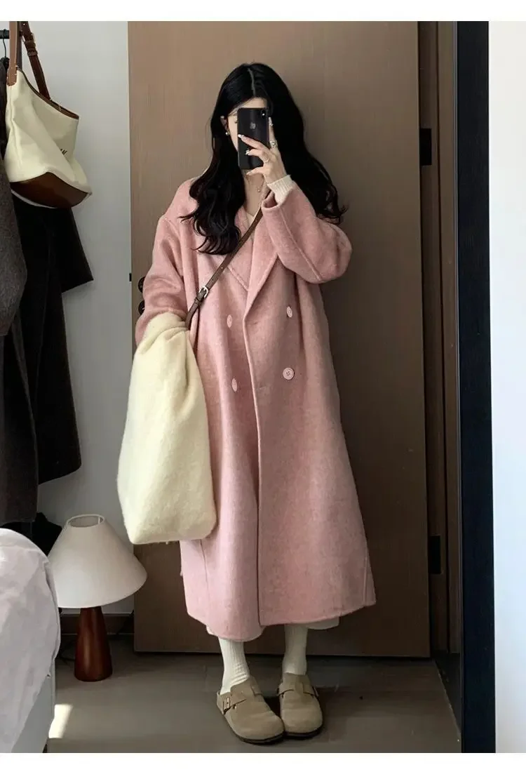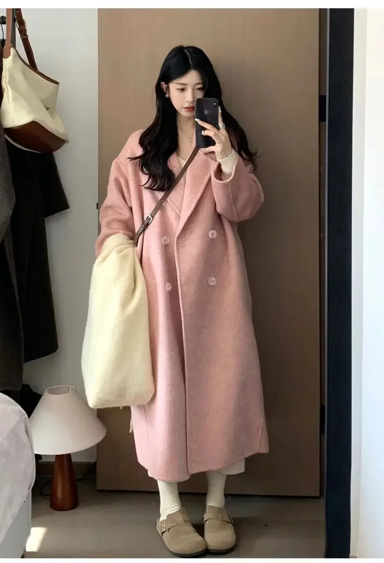Oatmeal Color Woolen Coat Women's Loose Mid-Length Korean Style Autumn Winter New Arrival Fashion Outerwear Pure Color Full Slee