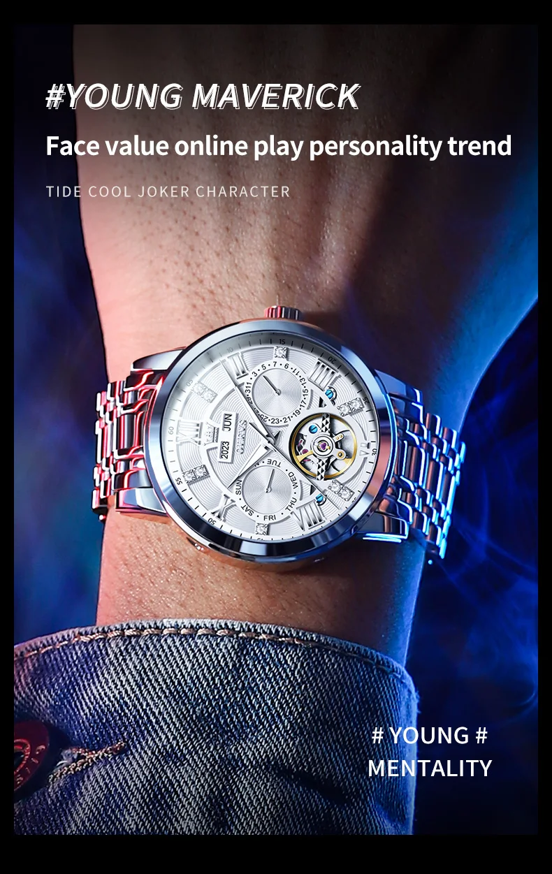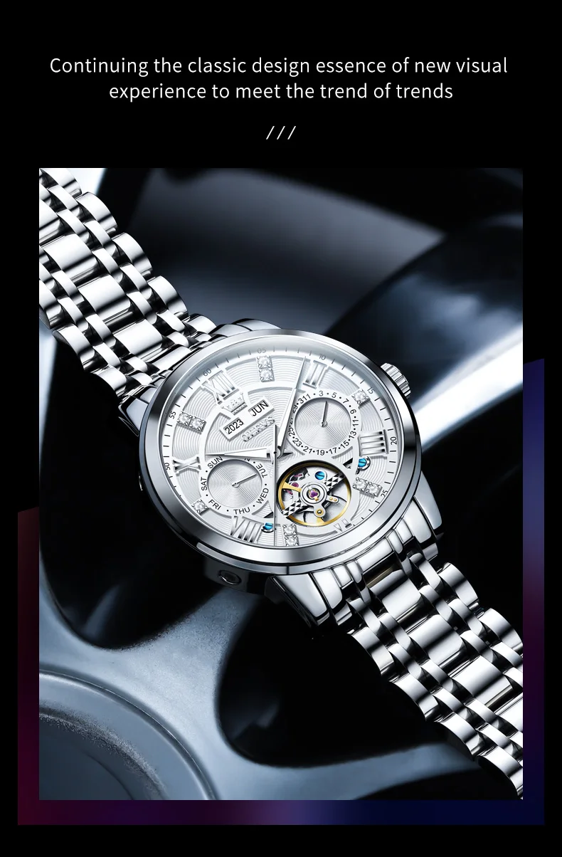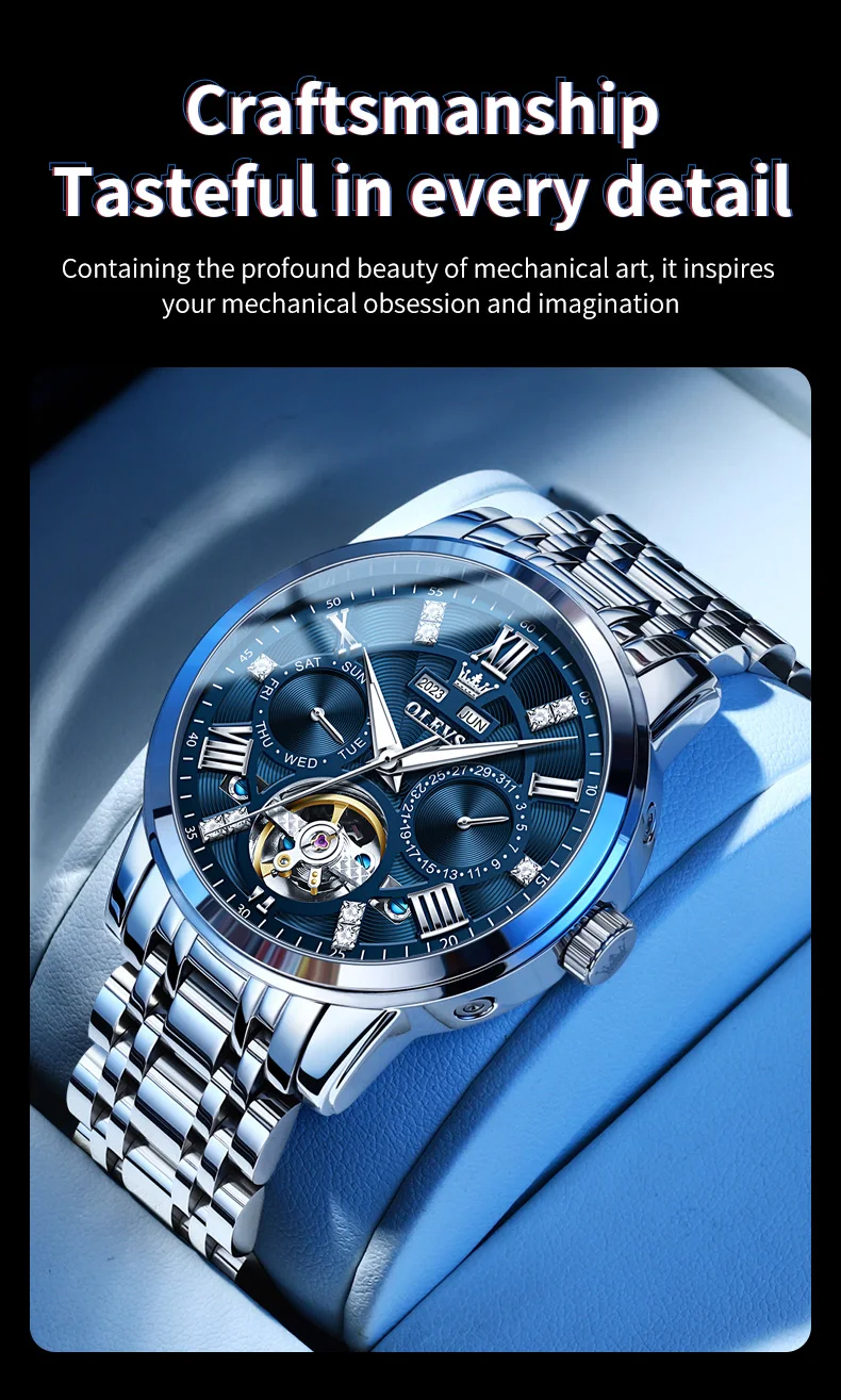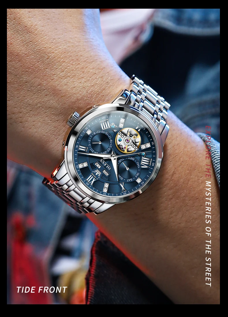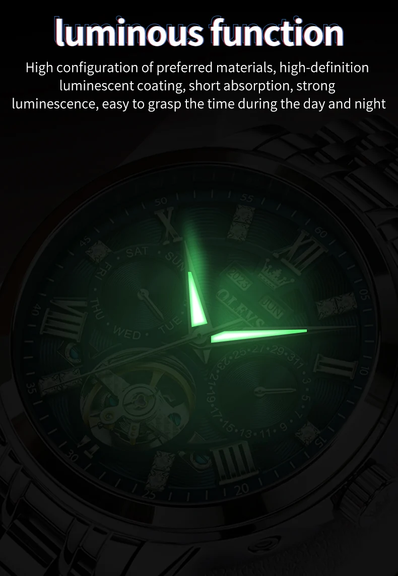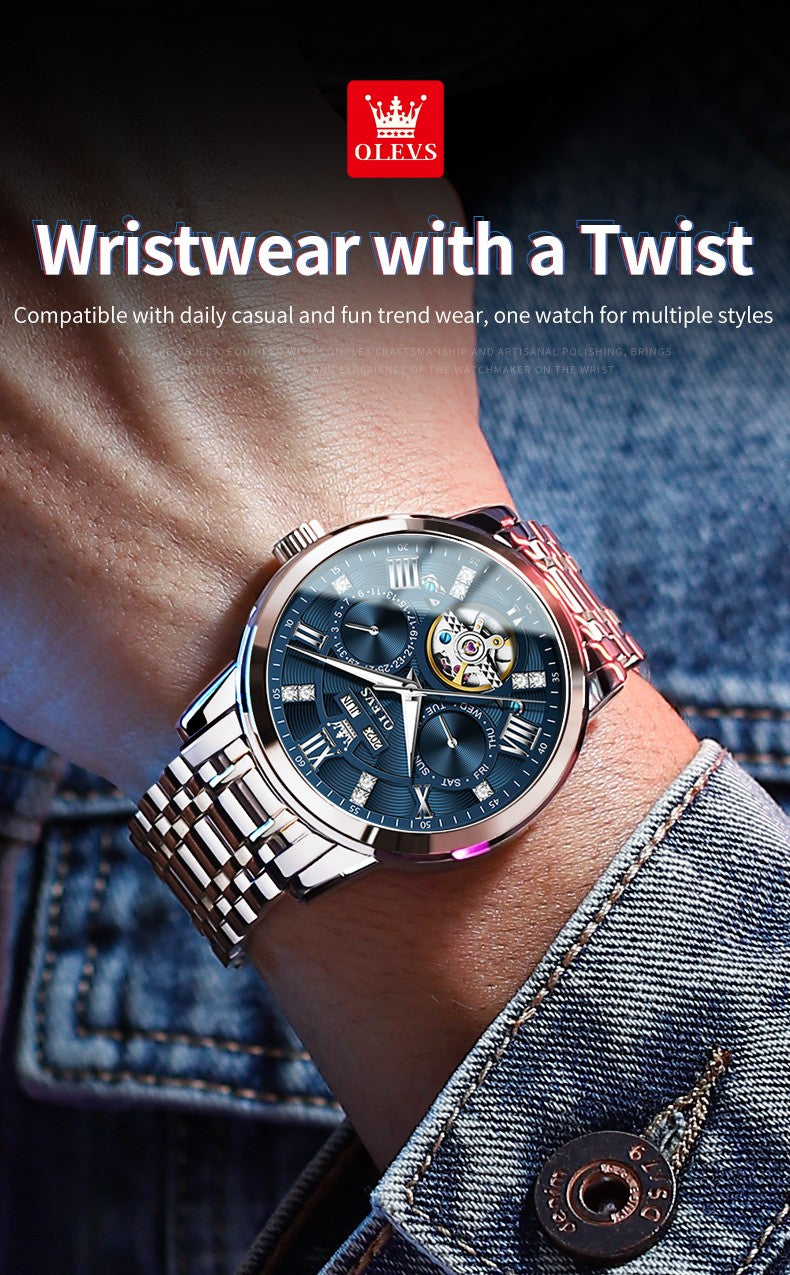 OLEVS Men's Watches Skeketon Flywheel Automatic Mechanical Original Wristwatch for Man Waterproof Luminous Perpetual Calendar