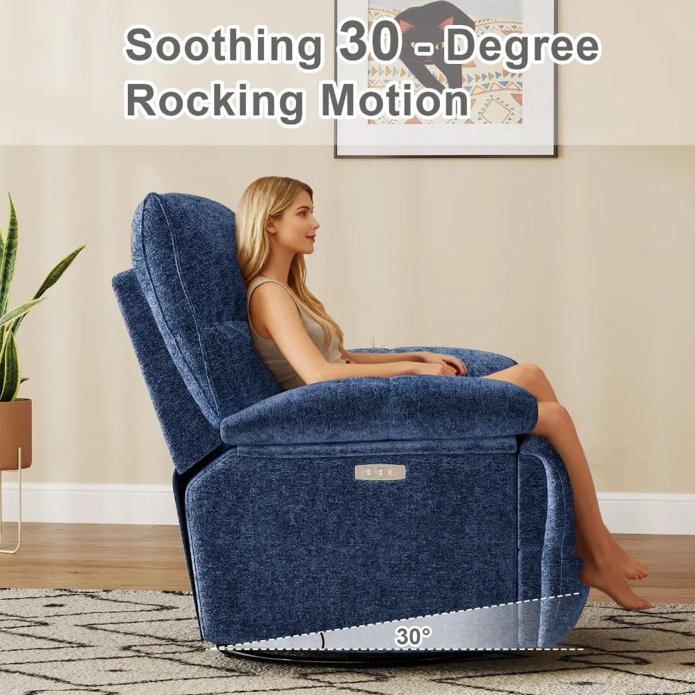 ?SWIVEL, ROCK, & RECLINE? - Adjust to your perfect recline or upright position effortlessly with the simple push of two buttons on this electric recliner chair. Equipped with quiet motors for a durable, consistent experience, it's perfect for relaxation or phone use. The built-in USB and Type-C port on the control panel charges your devices conveniently. Ideal for home or office, this cozy recliner offers a 140-degree recline and a 30-degree soothing rocking motion for full-body zero-gravity relaxation. Enjoy the freedom to move in any direction with a 270-degree rotation, providing unparalleled flexibility and ease. A thoughtful gift for yourself or a loved one.