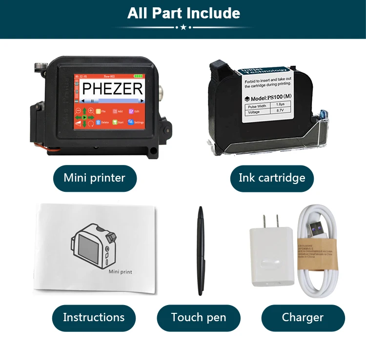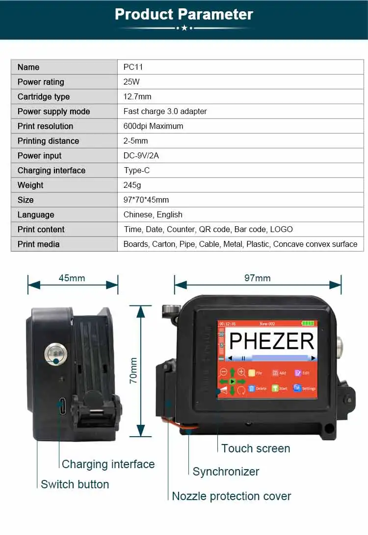 Phezer 30 Languages 12.7/25.4mm PC11Plus Mini Printer Portable Printer QR Bar Code Date Logo Expiry Date Handheld Inkjet Printer