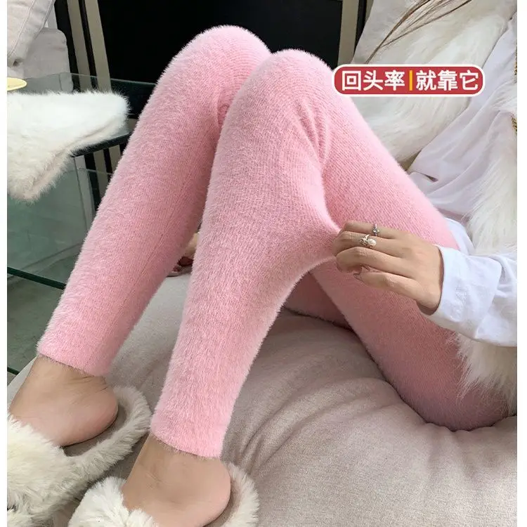 Pink Mink Velvet Pants Women High Waist Elasticity Plush Casual Thermal Leggings Tight Knitted Straight Wear Outside Trousers