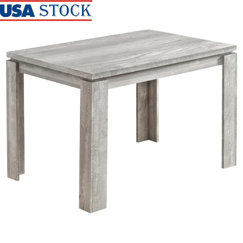 Dining table in a trending grey reclaimed wood look finish with thick, block-style legs to keep everything in its place during your large gatherings The robust panel construction of the grey reclaimed look table top makes for the perfect farmhouse dining table Sit comfortably on this kitchen table that seats up to 4 people Compact size dining room table fits perfectly in a casual or formal dining area in small homes, apartments or condos Product Dimensions: 47 Inch L x 32 Inch D x 31 Inch H