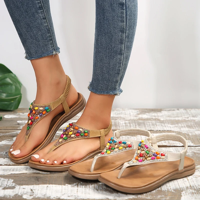Retro Bohemian Flat Heels Sandals for Women 2024 summer Rhinestone Beads Clip Toe Sandals Woman Lightweight Beach Flip Flops