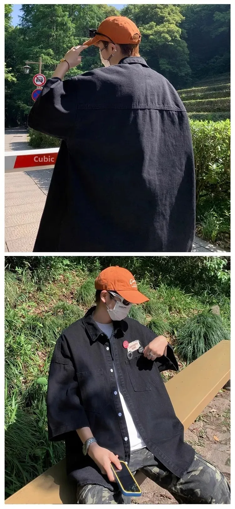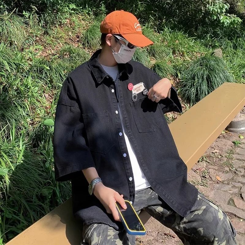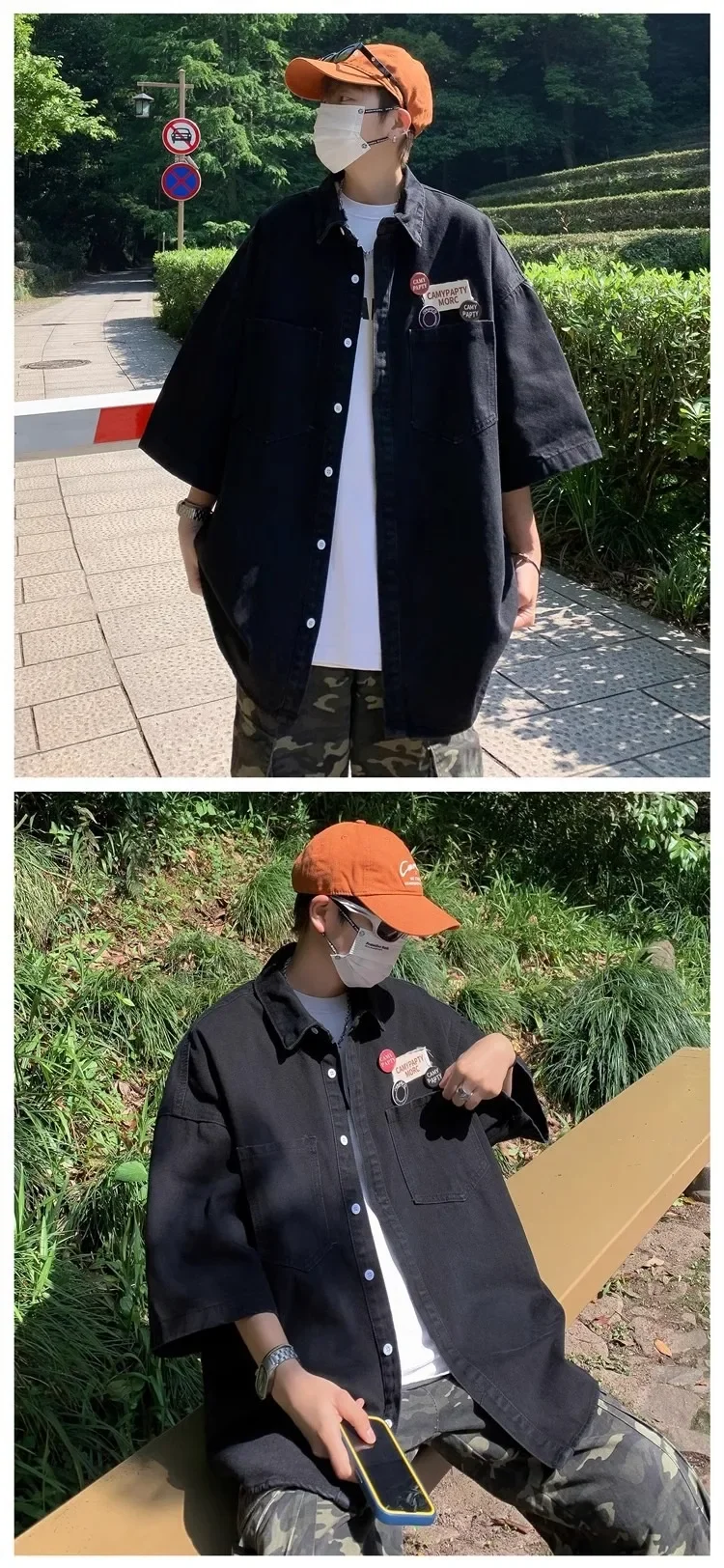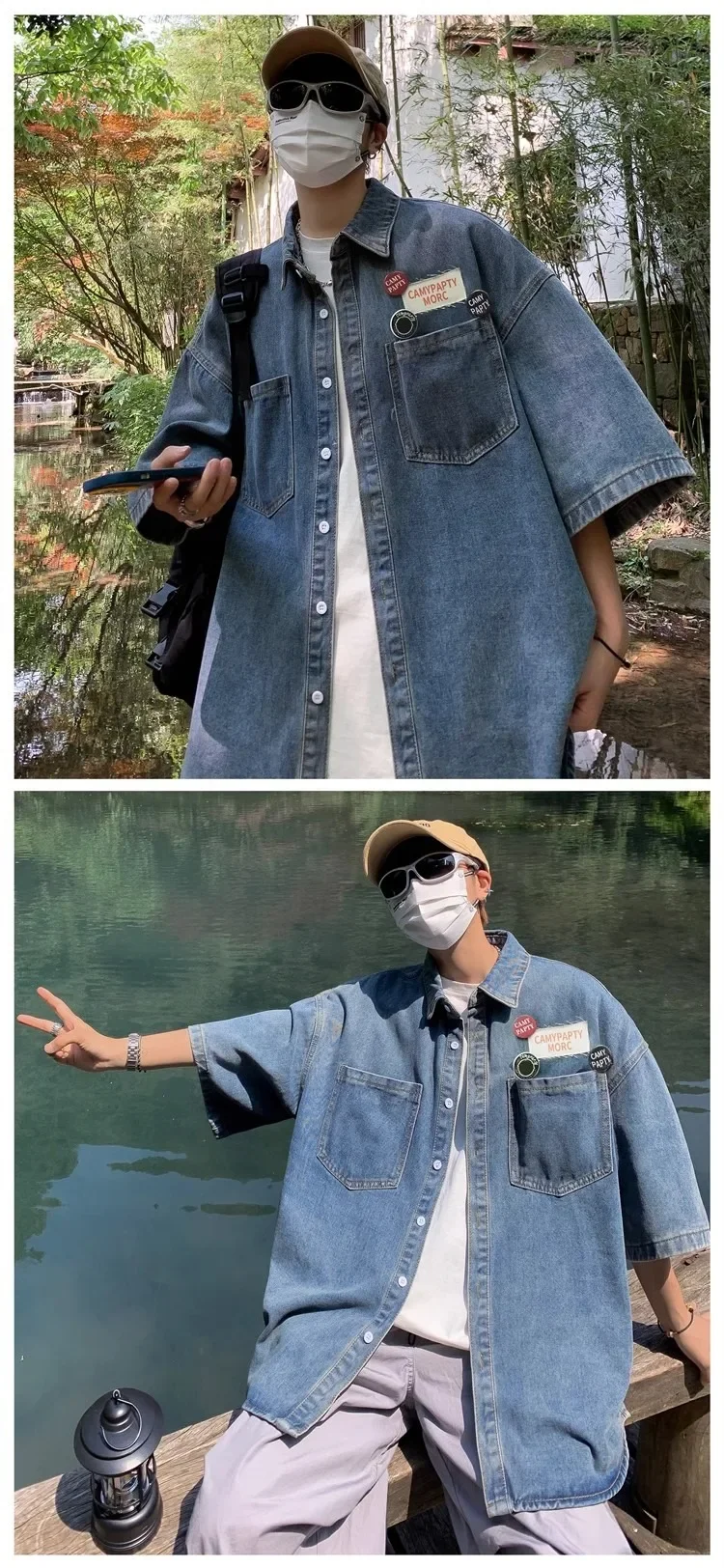 Retro Japanese Style Pocket Badge Denim Short Sleeve Casual Shirt Men's Loose Collar Jacket Trendy Summer Clothing