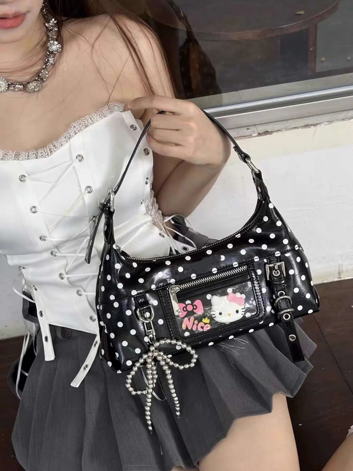 Retro oil wax leather crossbody bag, contrasting polka dot mini armpit bag, girls' shoulder bag