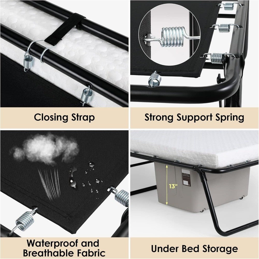 • Heavy-Duty Foldable Bed: Support up to 300 pounds. The frame of the portable bed for adults is constructed of premium quality rugged steel. The dense spring-supported and reinforced structure ensures the best support and stability for long-term use.