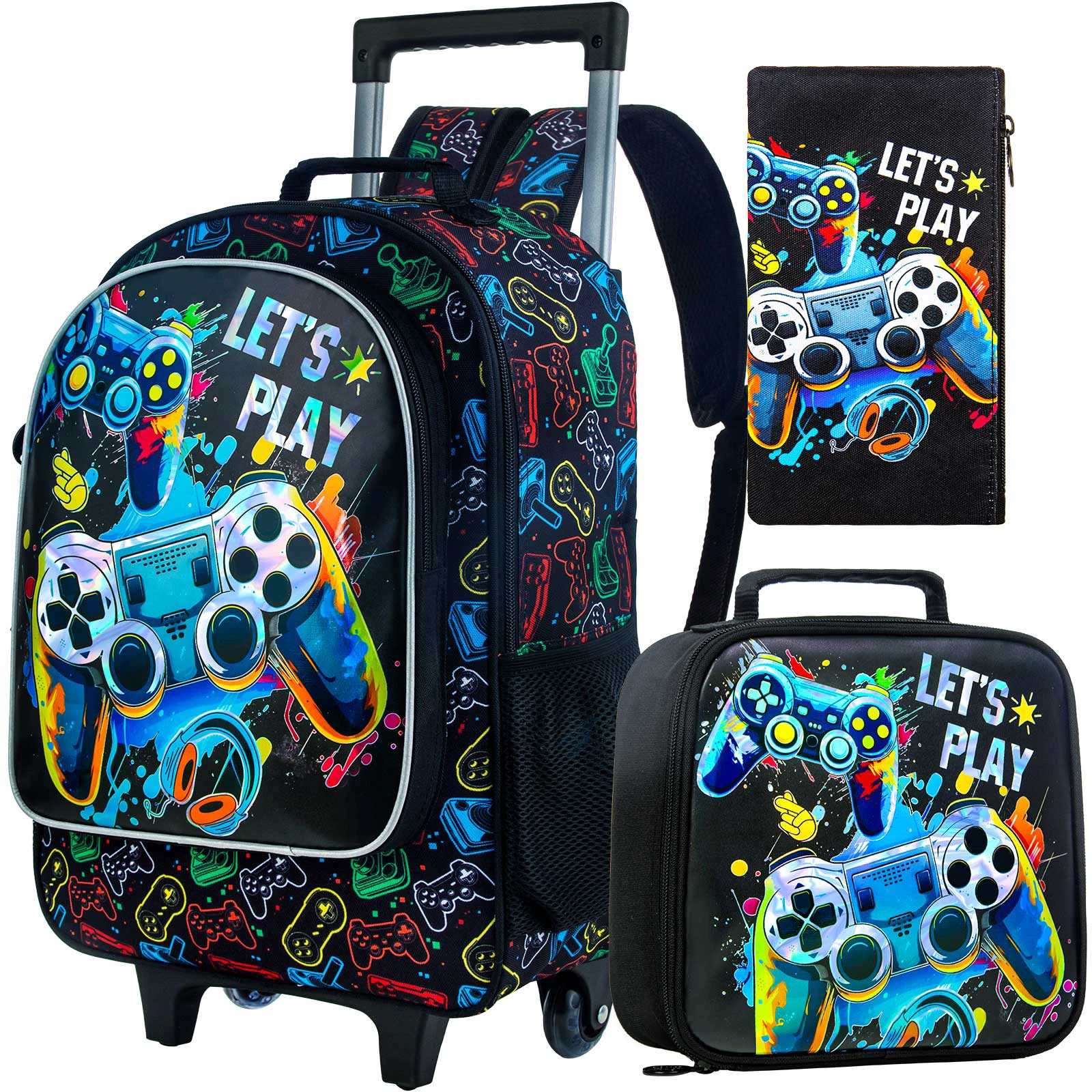 3PCS Rolling Backpack Set: Rolling backpack for boys:18"x 13"x 6", lunch box:8.5"x 9.5"x 4"+ pencil bag,cool game console series set, providing more choices, convenience and happiness for your boys.