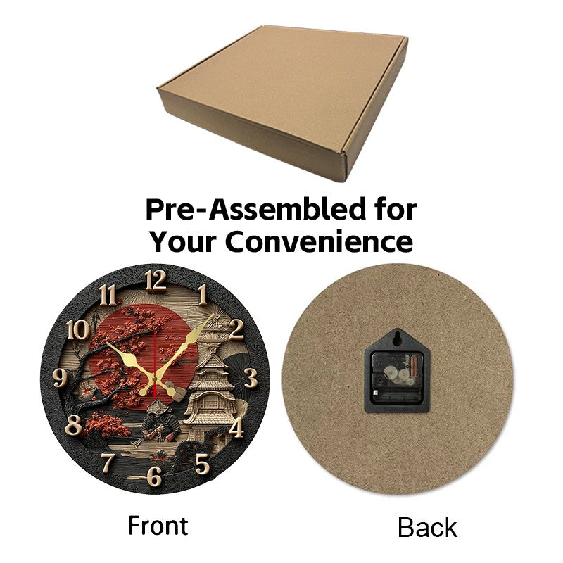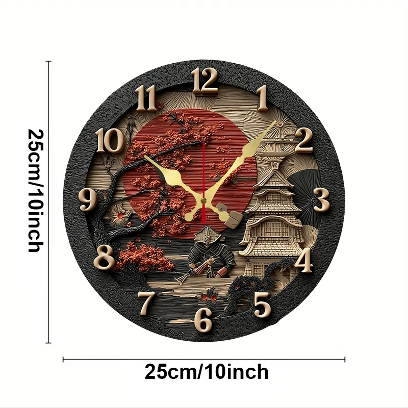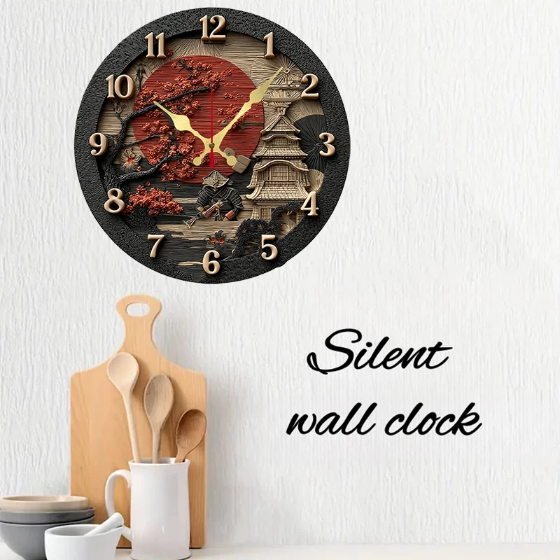 Samurai Themed Wooden Round Silent Hanging Wall Clock, Suitable For Living Room, Office, Study Room, Bedroom, Home Decoration