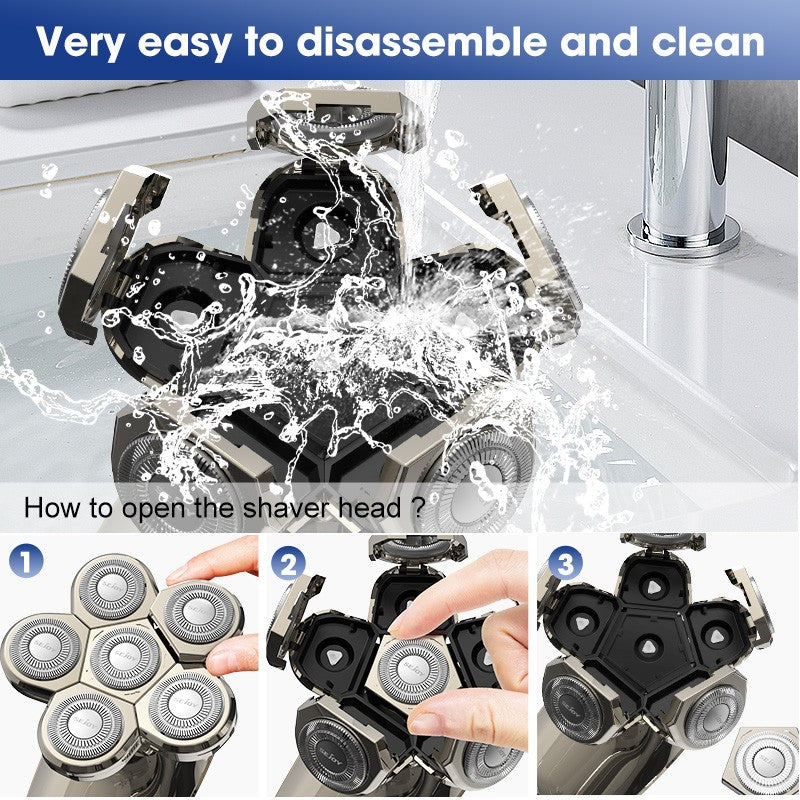 4.Wet & Dry Shave Easy Cleaning - Head shaver for men are designed to suit your needs, Enables you to shave with foam or water, even in the shower,. Washing with water, you need to flip up each blades, then the hair can then be completely cleaned out