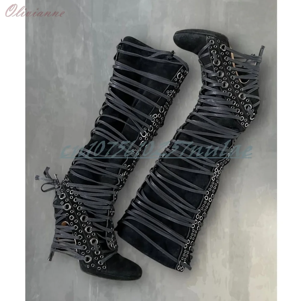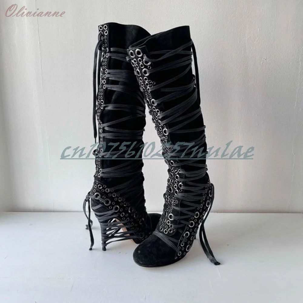Sexy Hollow Round Rivets Strappy Mid Calf Boots Round Toe Many BFashion Sexy Strappy Women Shoes 2025 Spring Zapatos Para Mujere