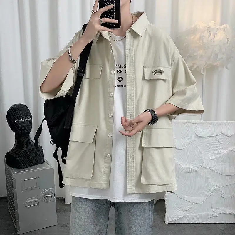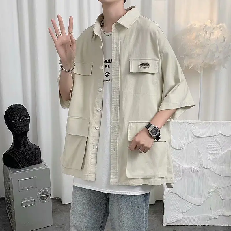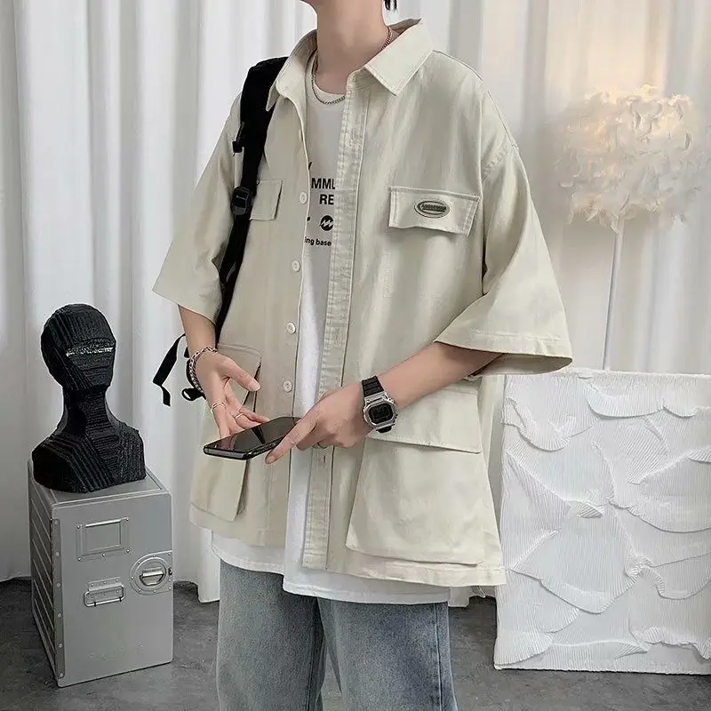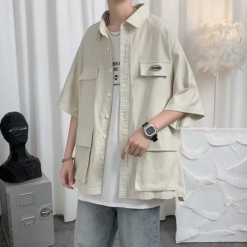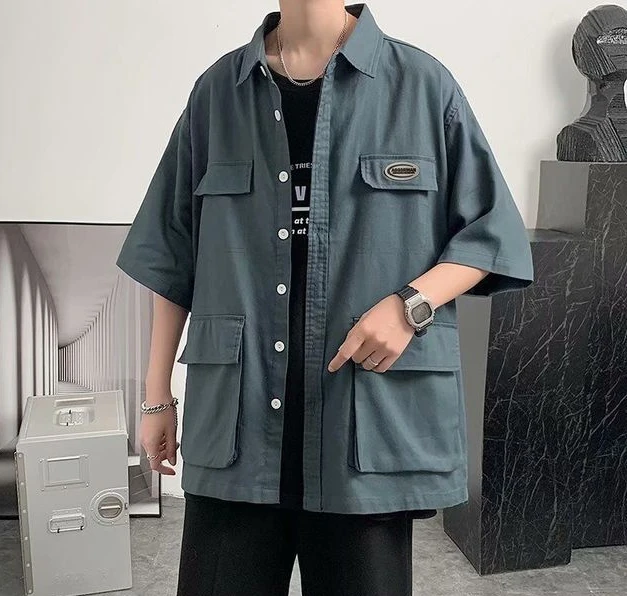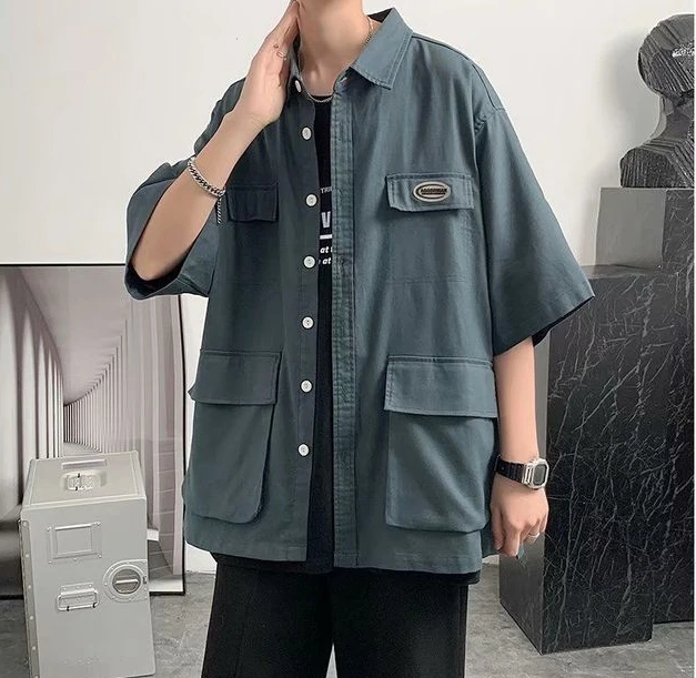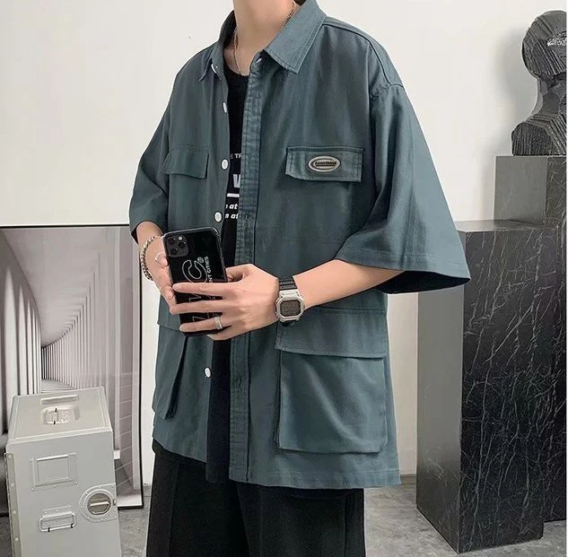 Shirts For Men With Pocket Cargo Man Shirt Loose Korean Style Casual Asia Cool Hipster Original Half Sleeve Fashion Collar I Xxl