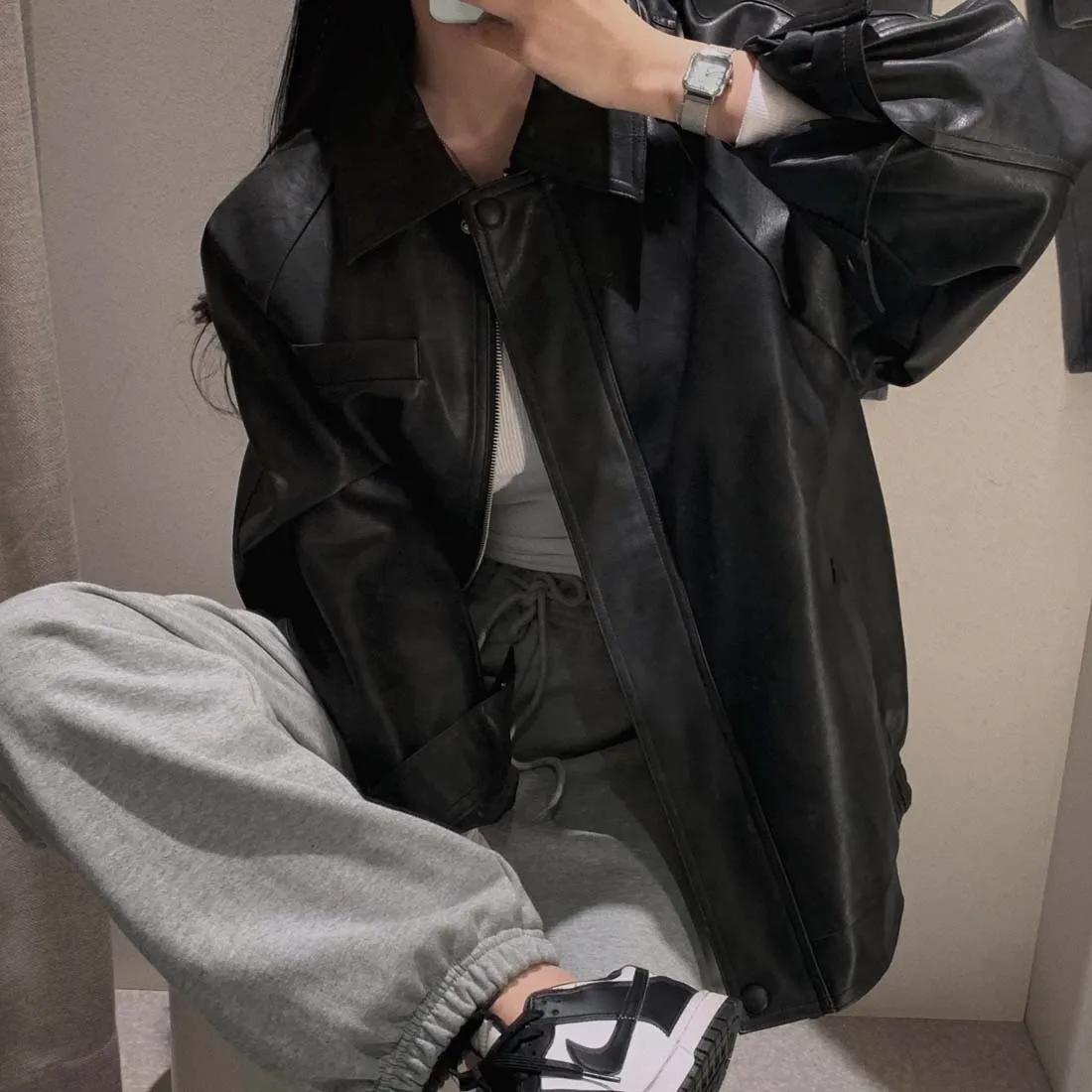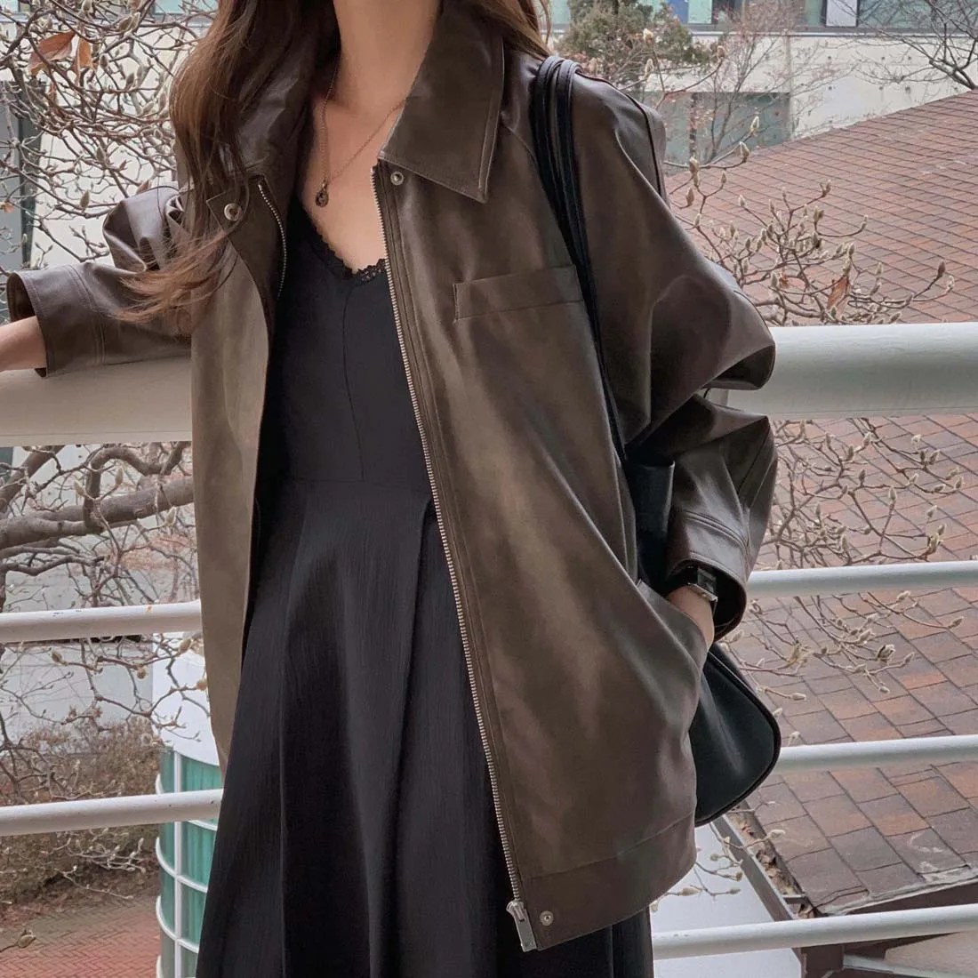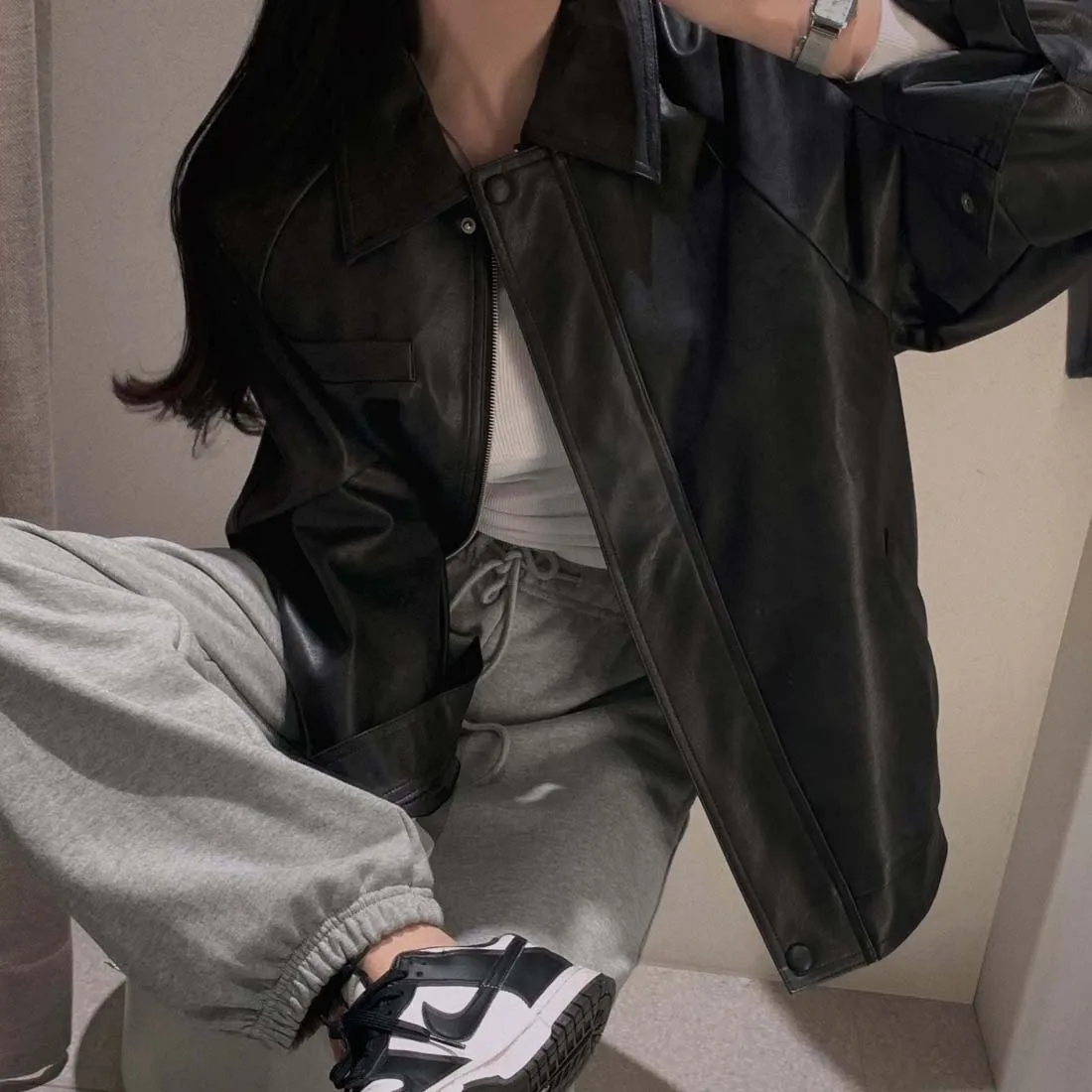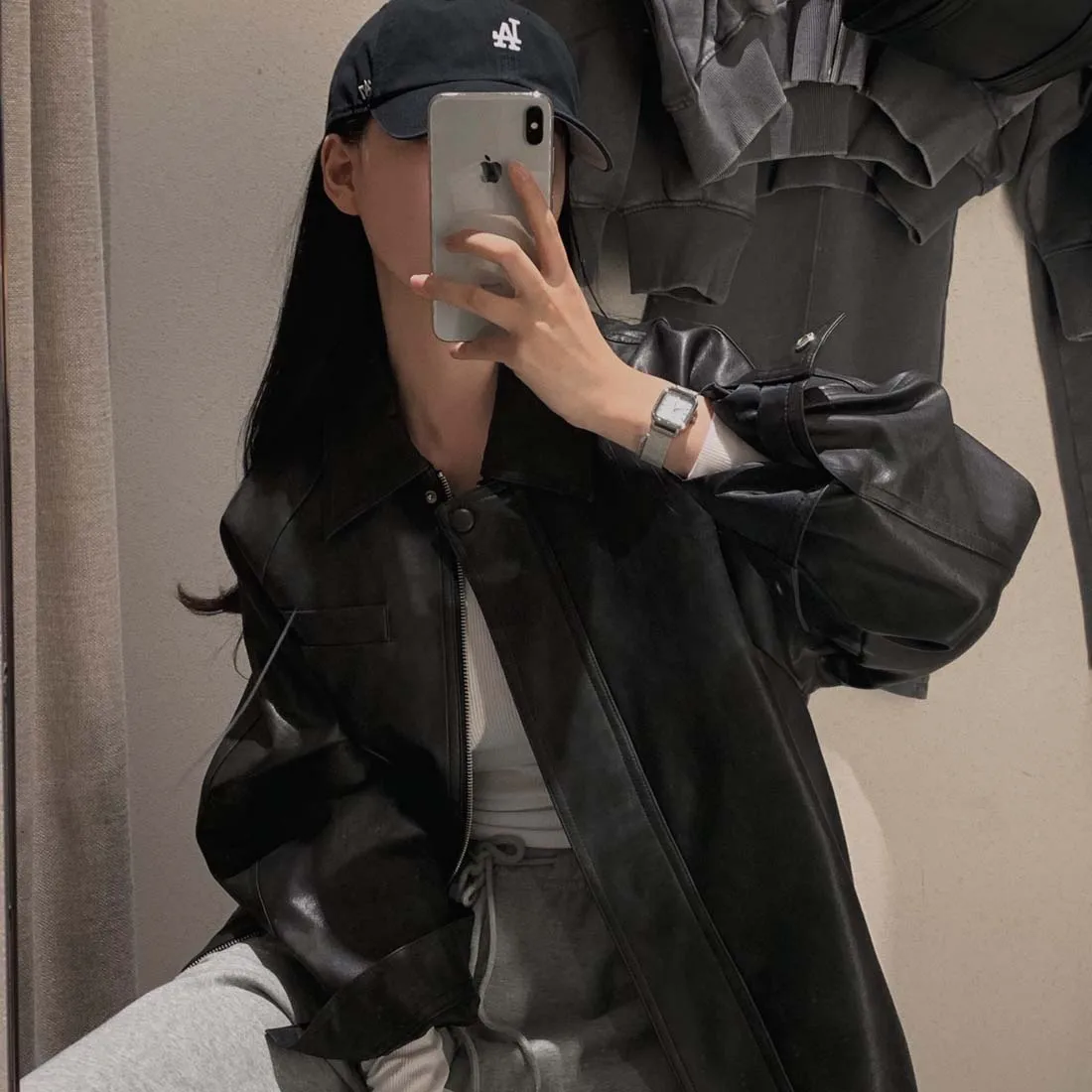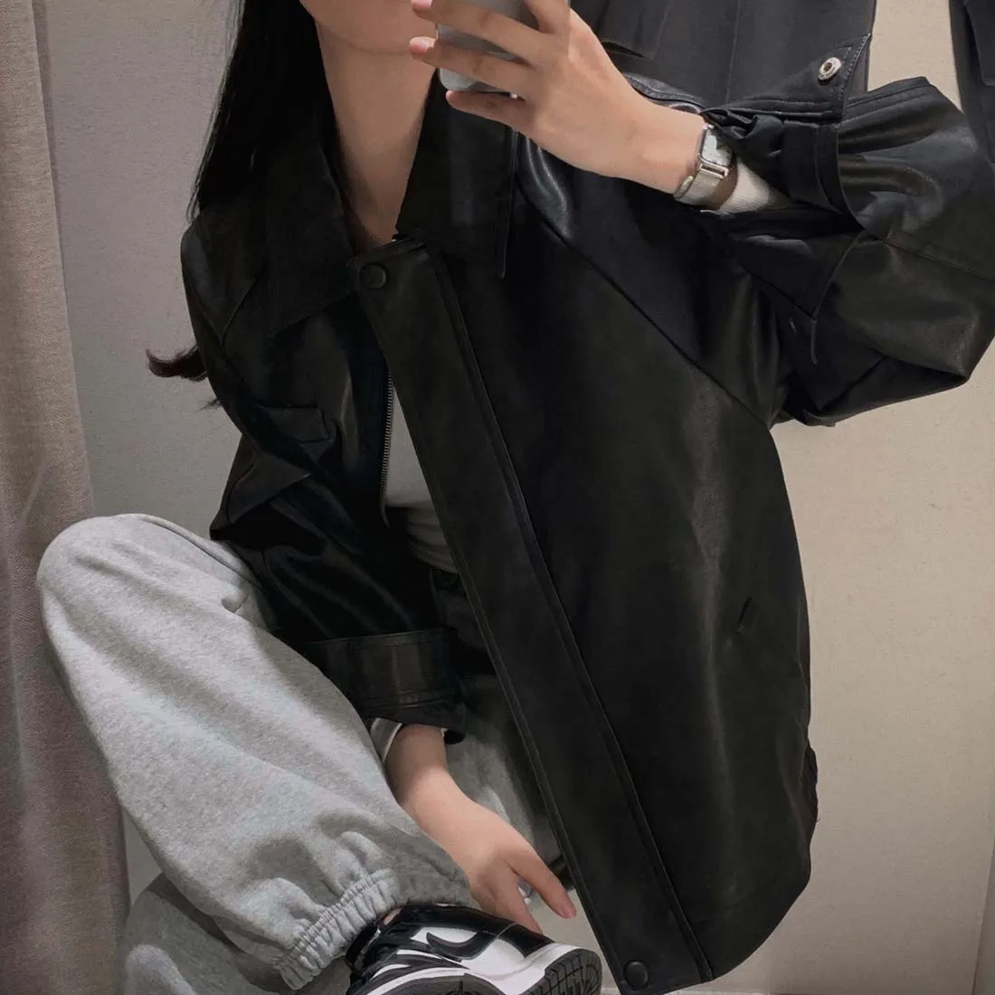 Sli Loose PU Leather Jaet Women's Chic Retro Collar Versatile BF Sle Motorcycle Clothes Trendy Long Sve Zipper