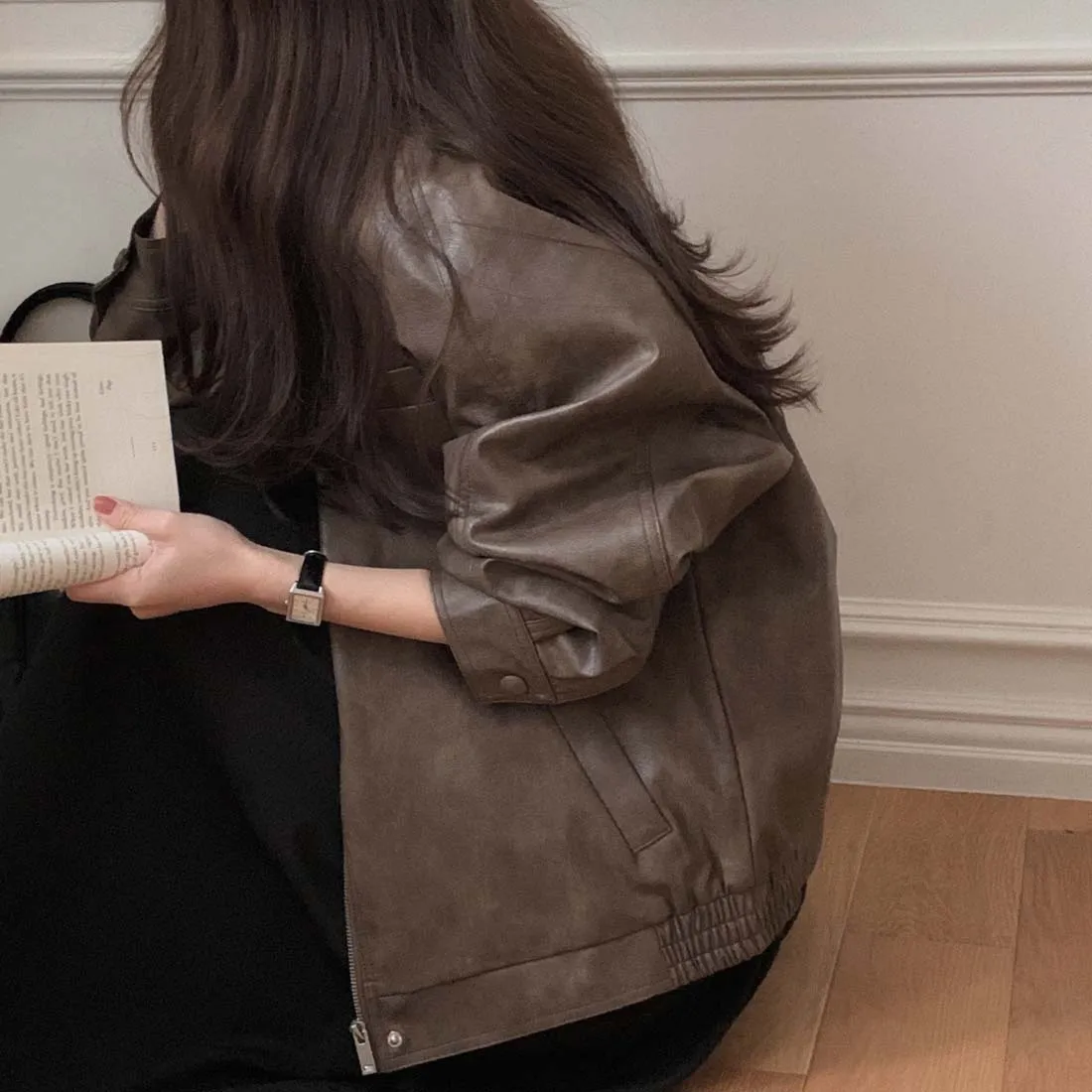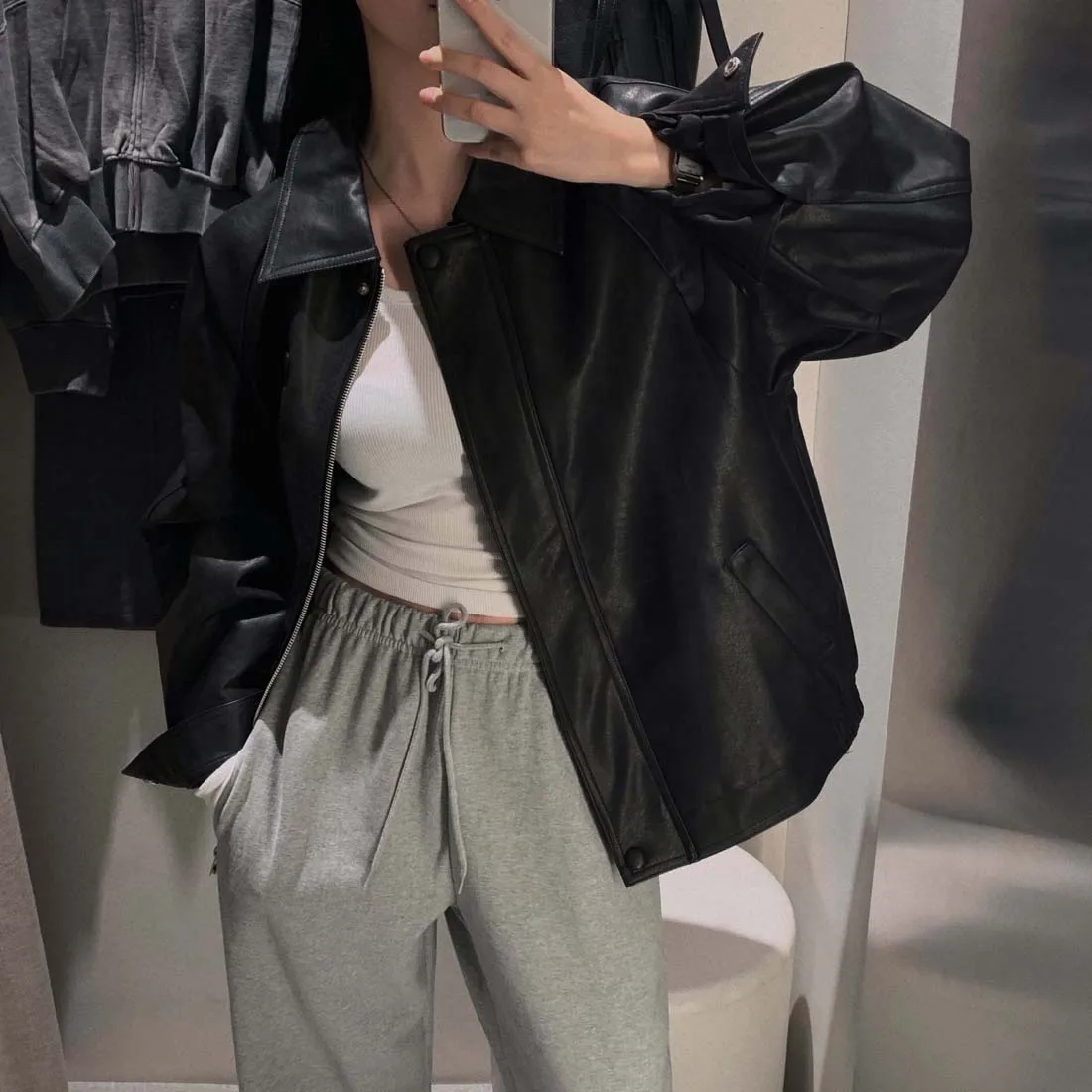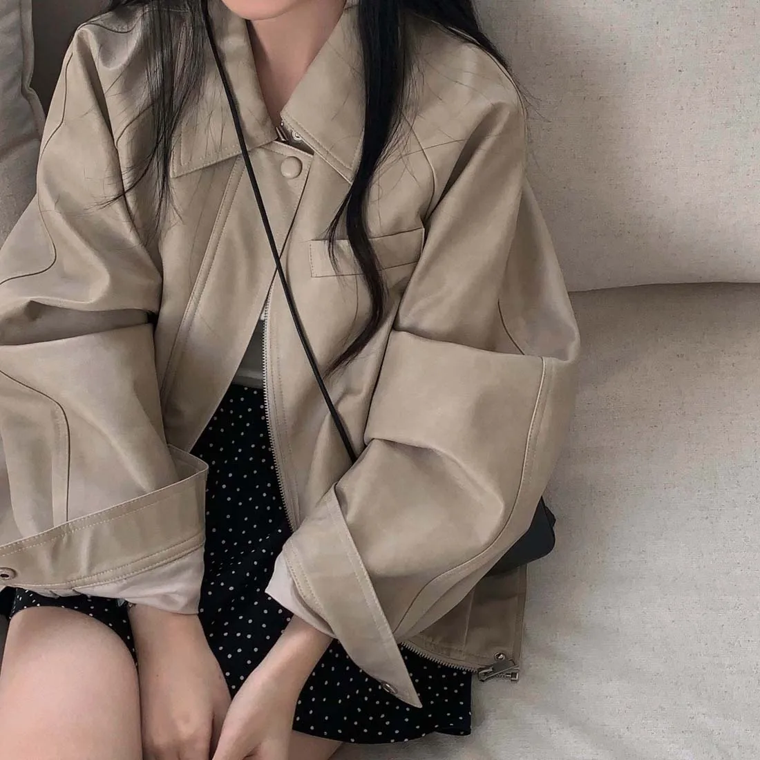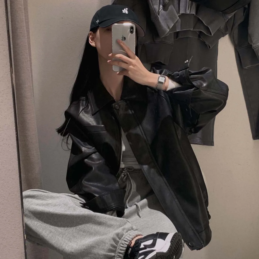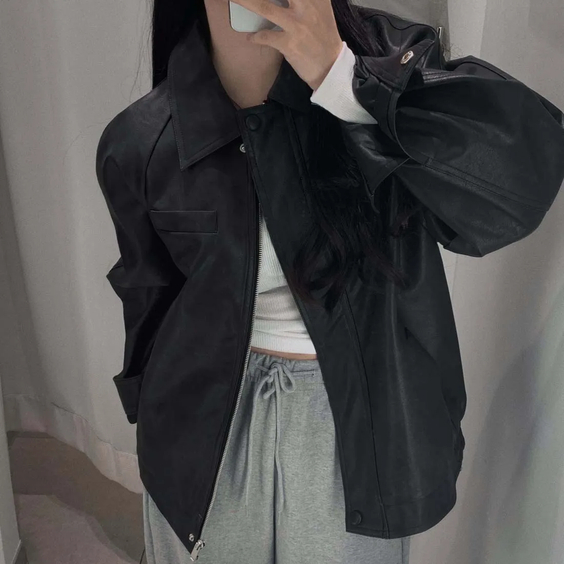Sli Loose PU Leather Jaet Women's Chic Retro Collar Versatile BF Sle Motorcycle Clothes Trendy Long Sve Zipper