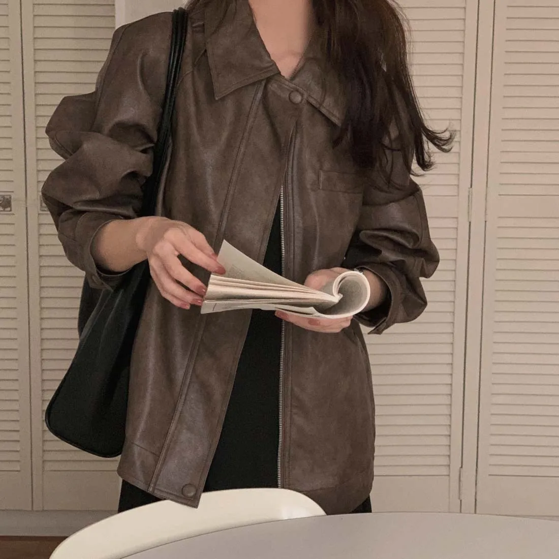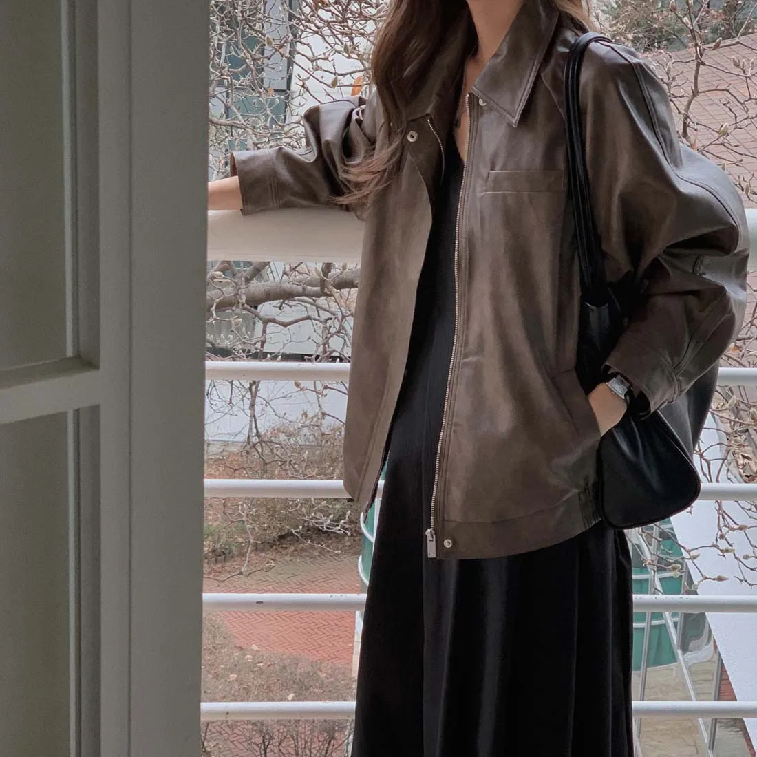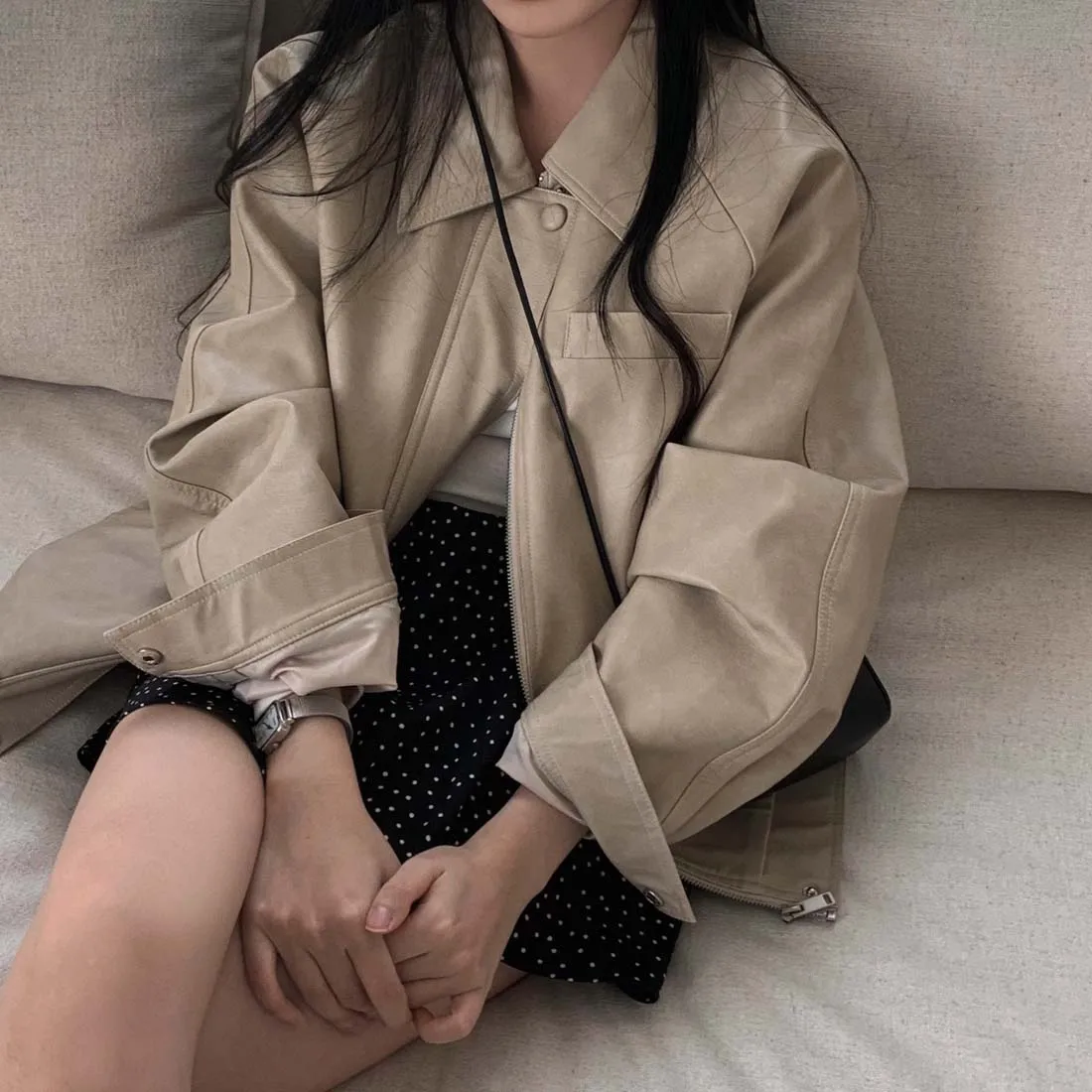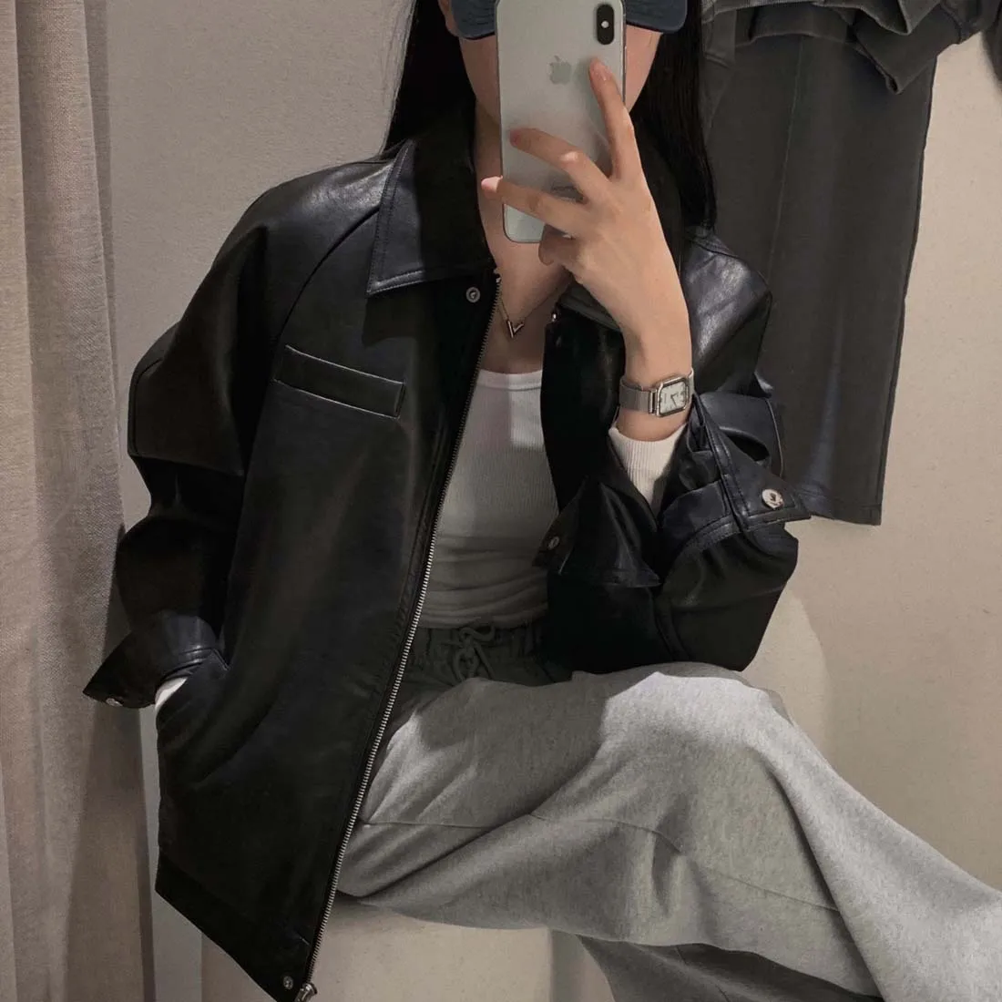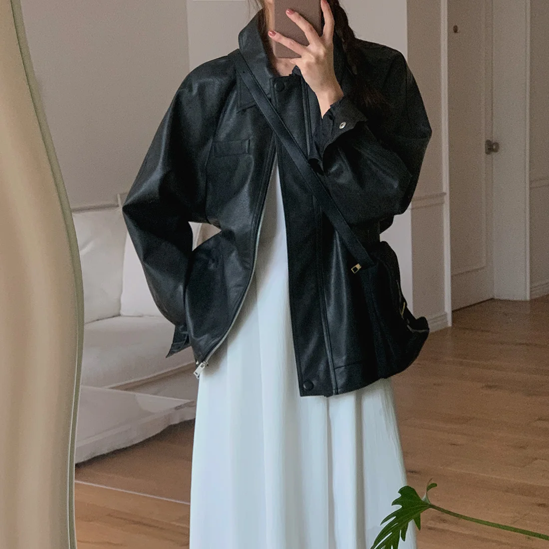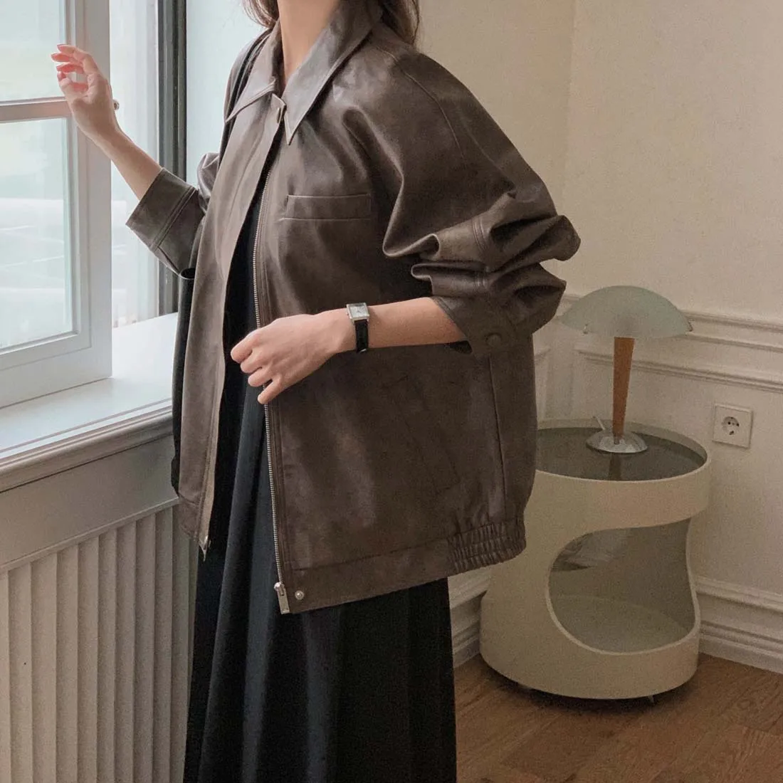 Sli Loose PU Leather Jaet Women's Chic Retro Collar Versatile BF Sle Motorcycle Clothes Trendy Long Sve Zipper