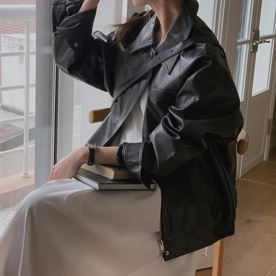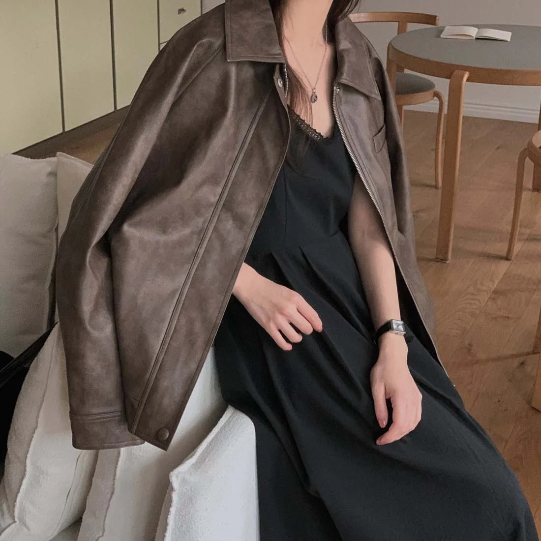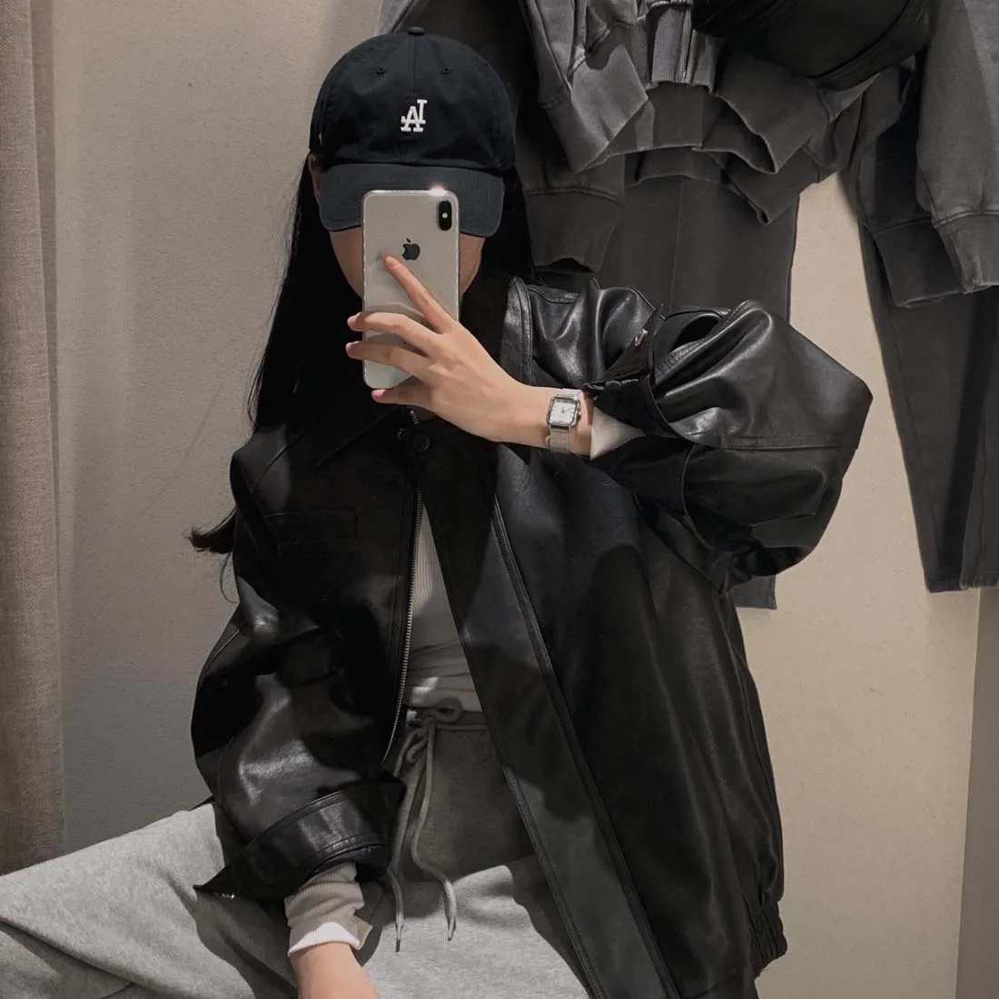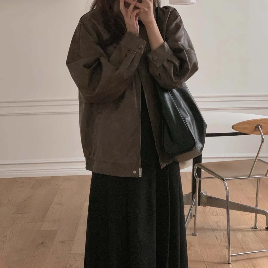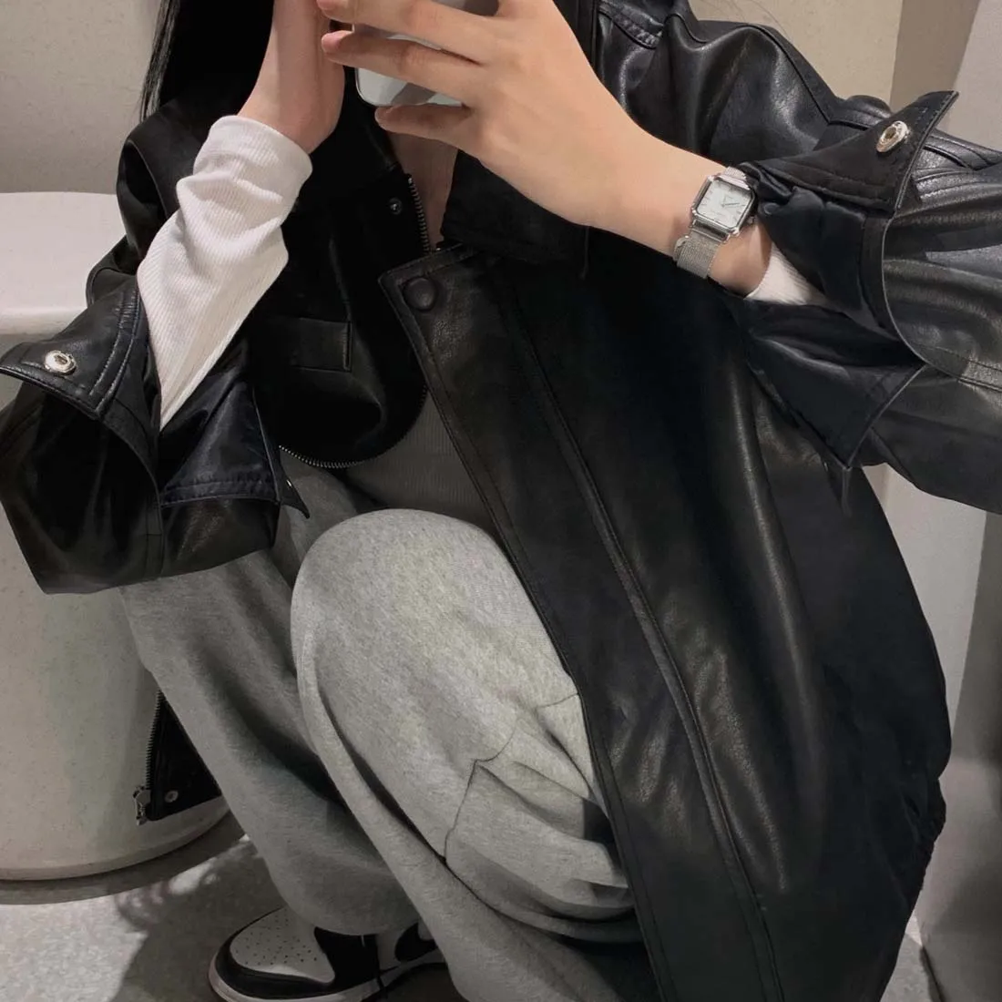 Sli Loose PU Leather Jaet Women's Chic Retro Collar Versatile BF Sle Motorcycle Clothes Trendy Long Sve Zipper