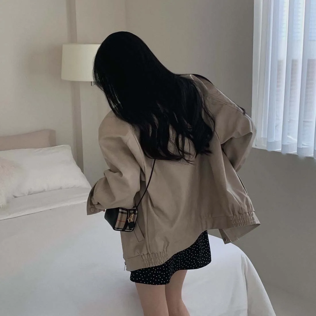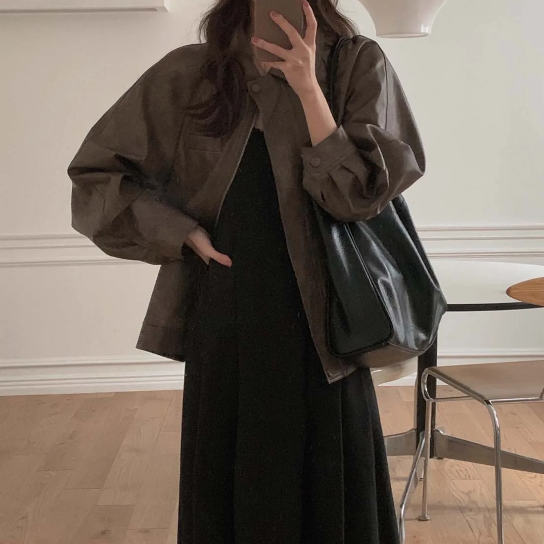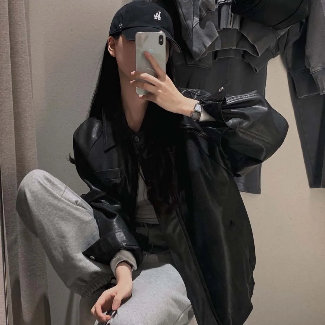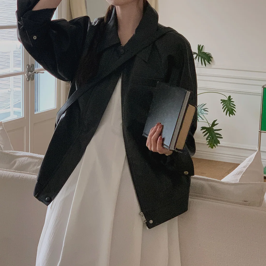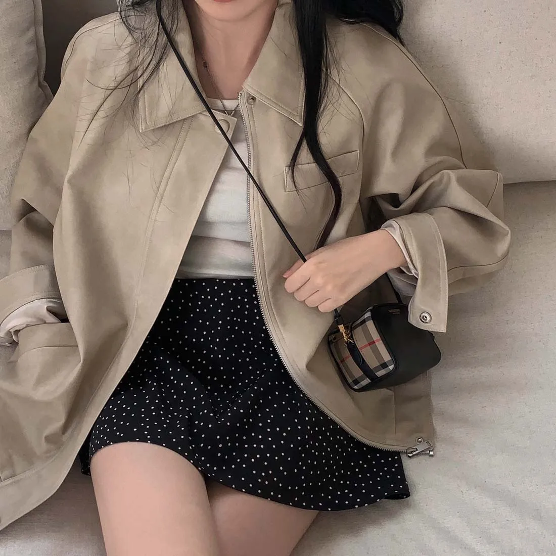Sli Loose PU Leather Jaet Women's Chic Retro Collar Versatile BF Sle Motorcycle Clothes Trendy Long Sve Zipper