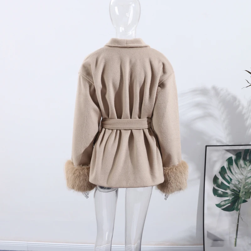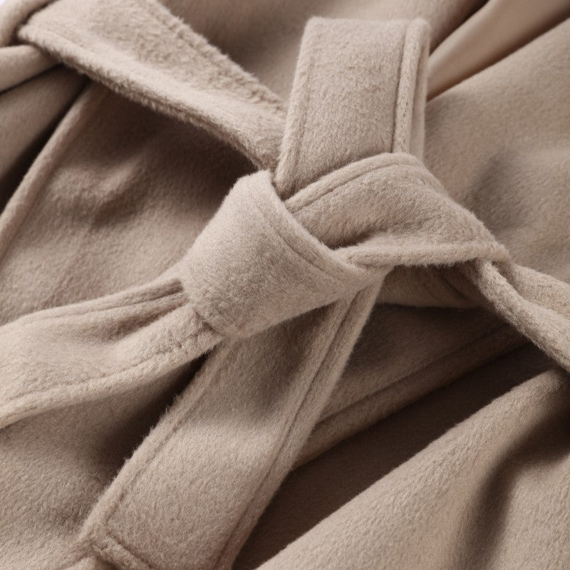 Solid Lace Up Faux Fur Sleeve Jacket Woman Elegant Mid-length V-neck Woolen Blend Coat Autumn Casual Fashion Scarf Outwear 2025