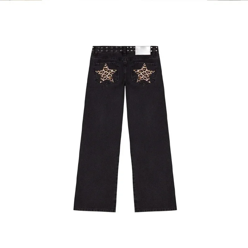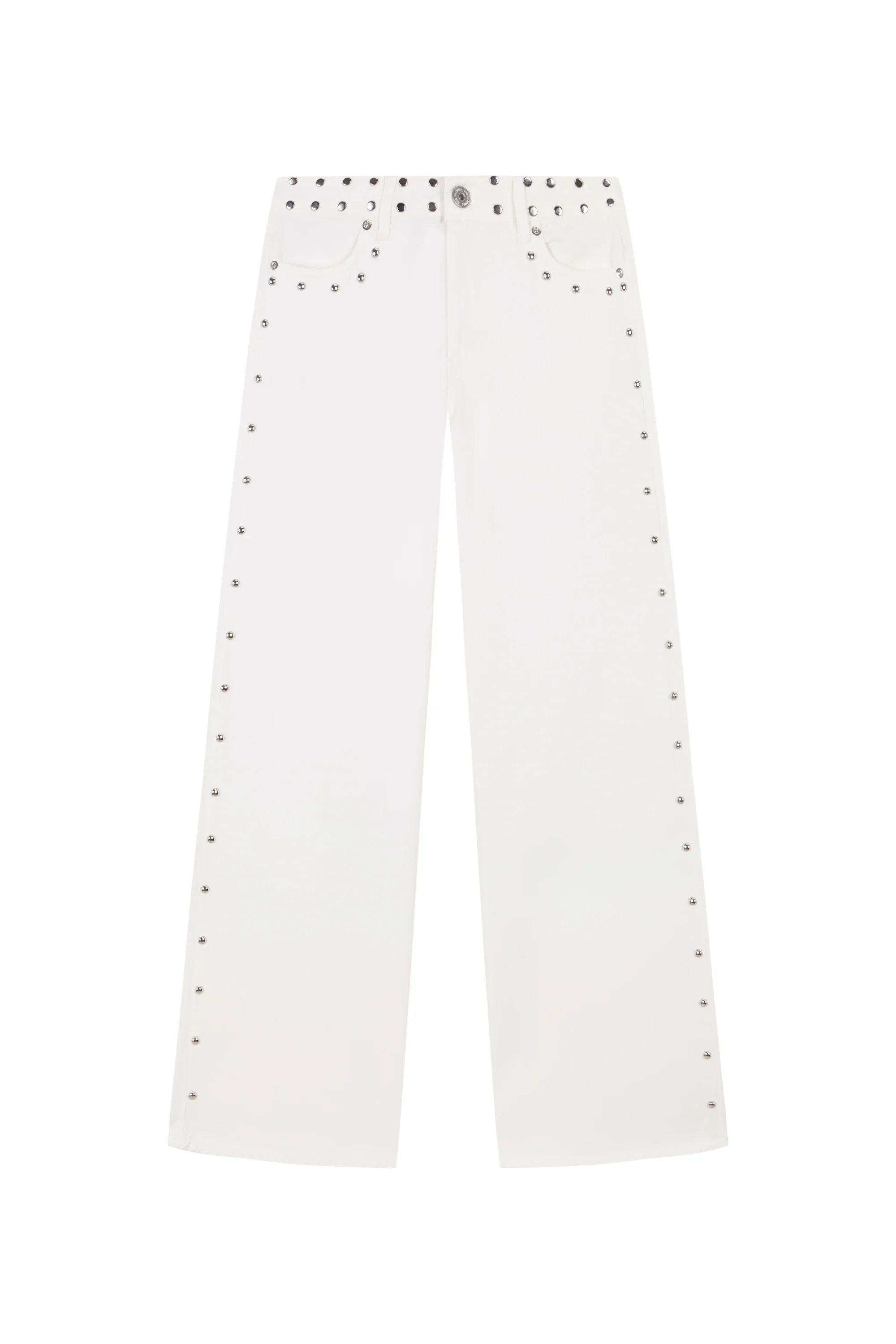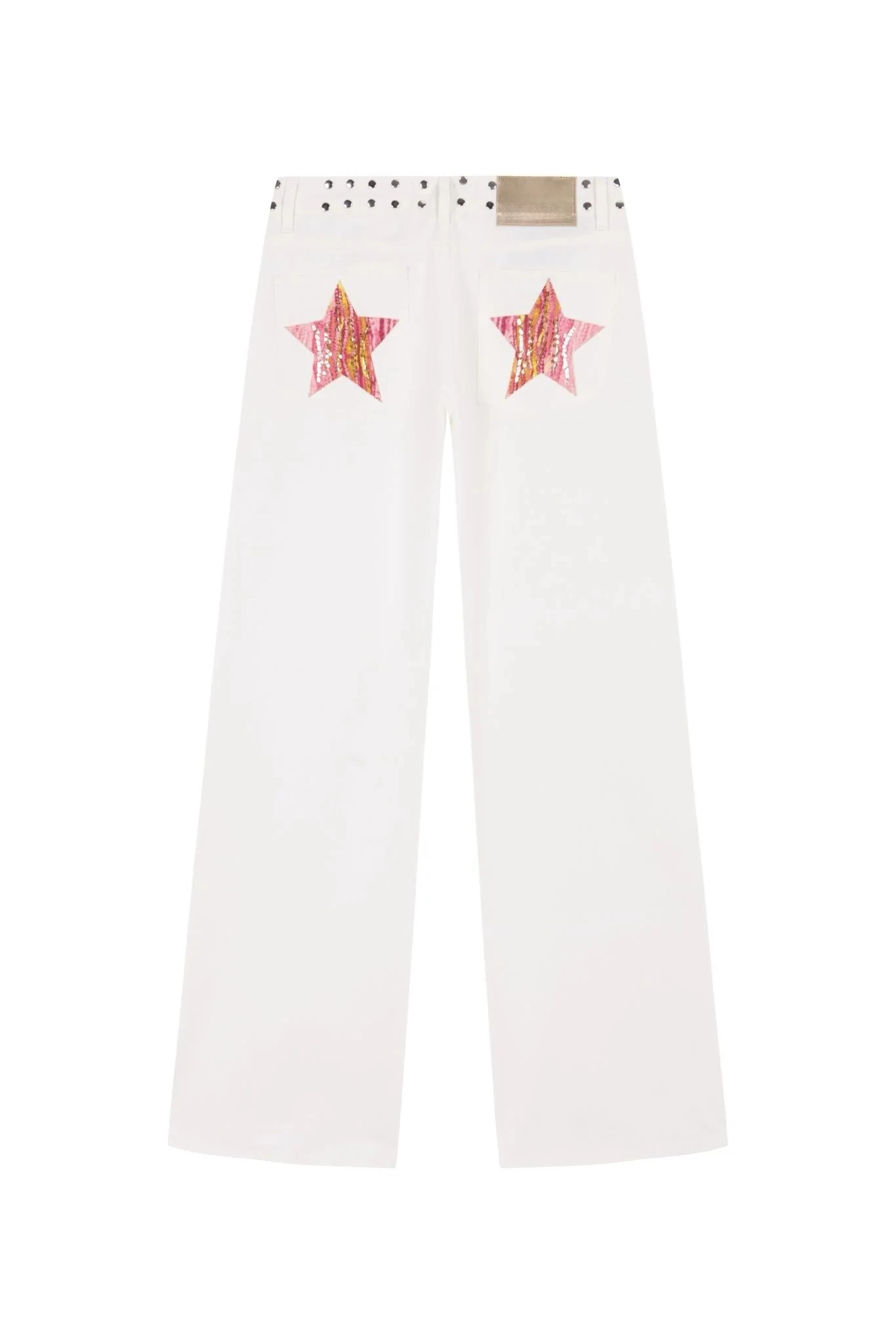 Spanish Street Fashion ONE DILEMMA Style Rivet Five-pointed Star Pattern White Jeans Women's Autumn Slim Straight Pants
