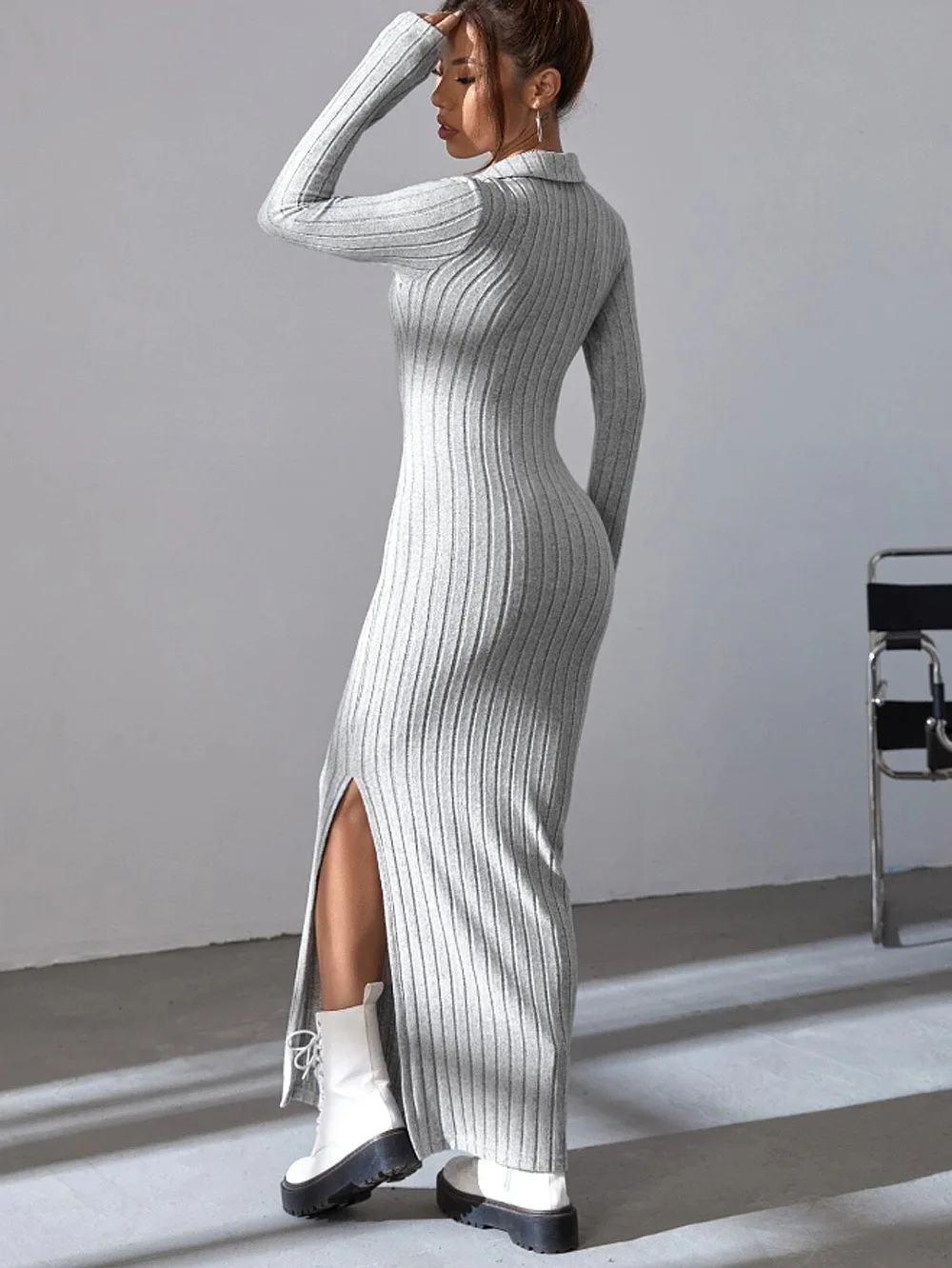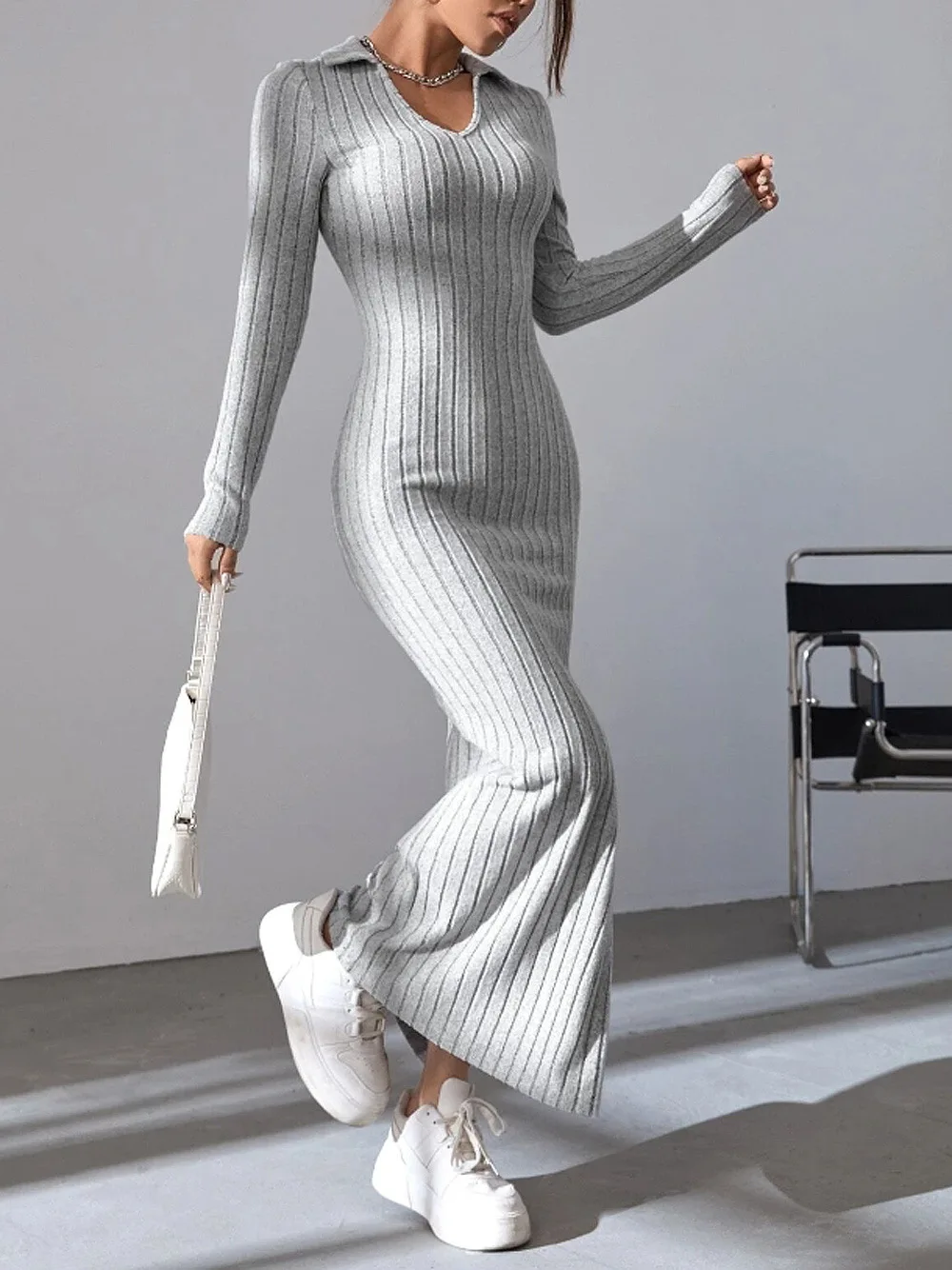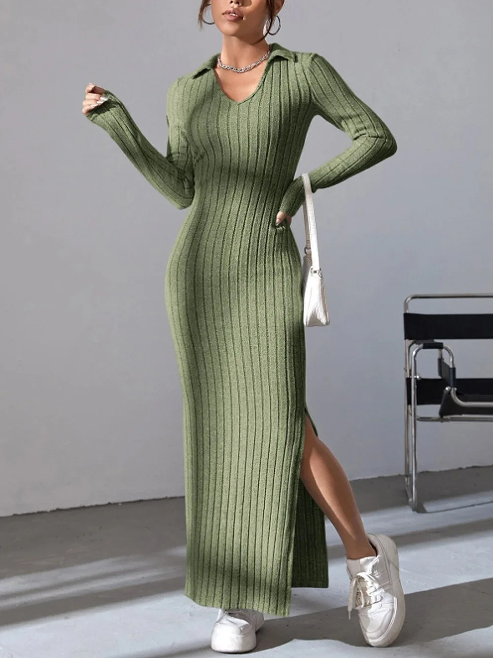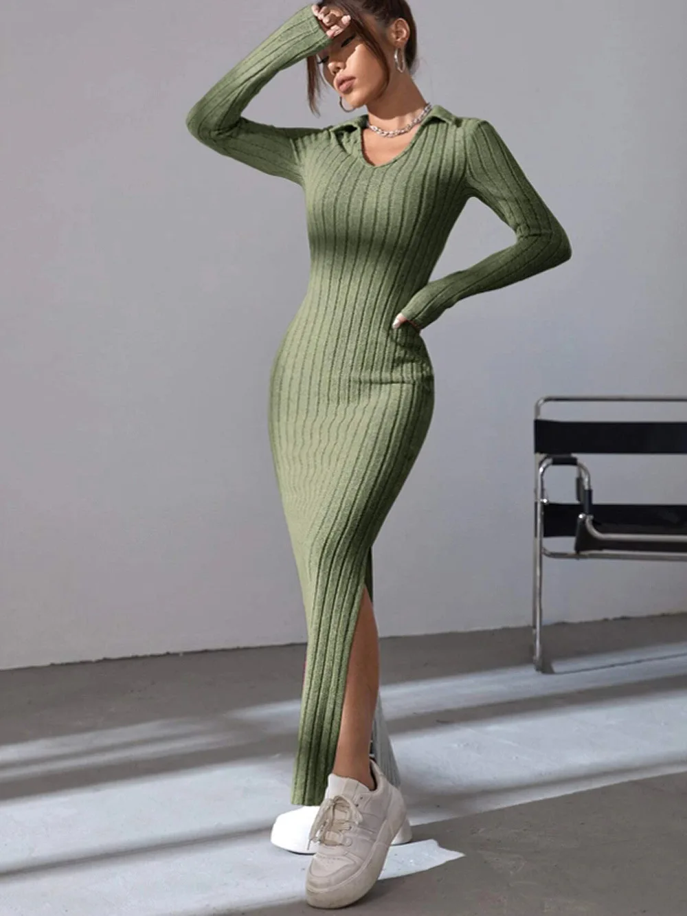 Spring and summer 2024 new style knitted slim lapel long sleeve dress pit strip solid color tight skirt