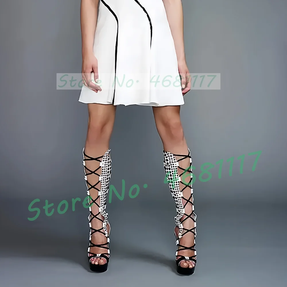 Strappy Polka Dot Platform Sandal Boots Women Sexy Party Cross Tied Mixed Colors Shoes Open Toe Women Summer Knee High Sandals