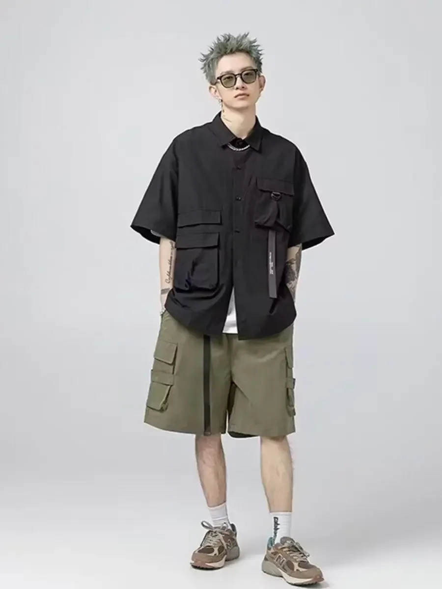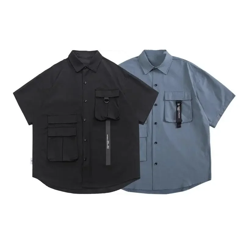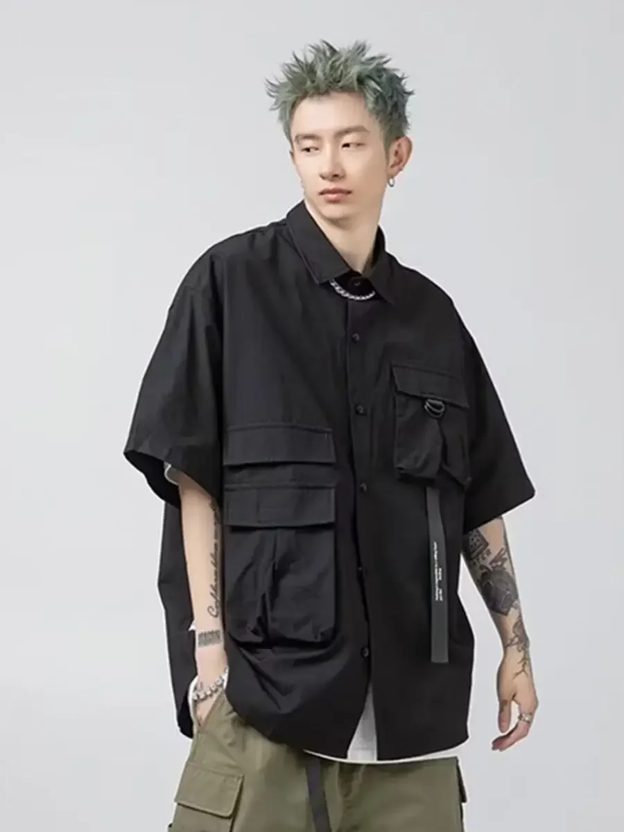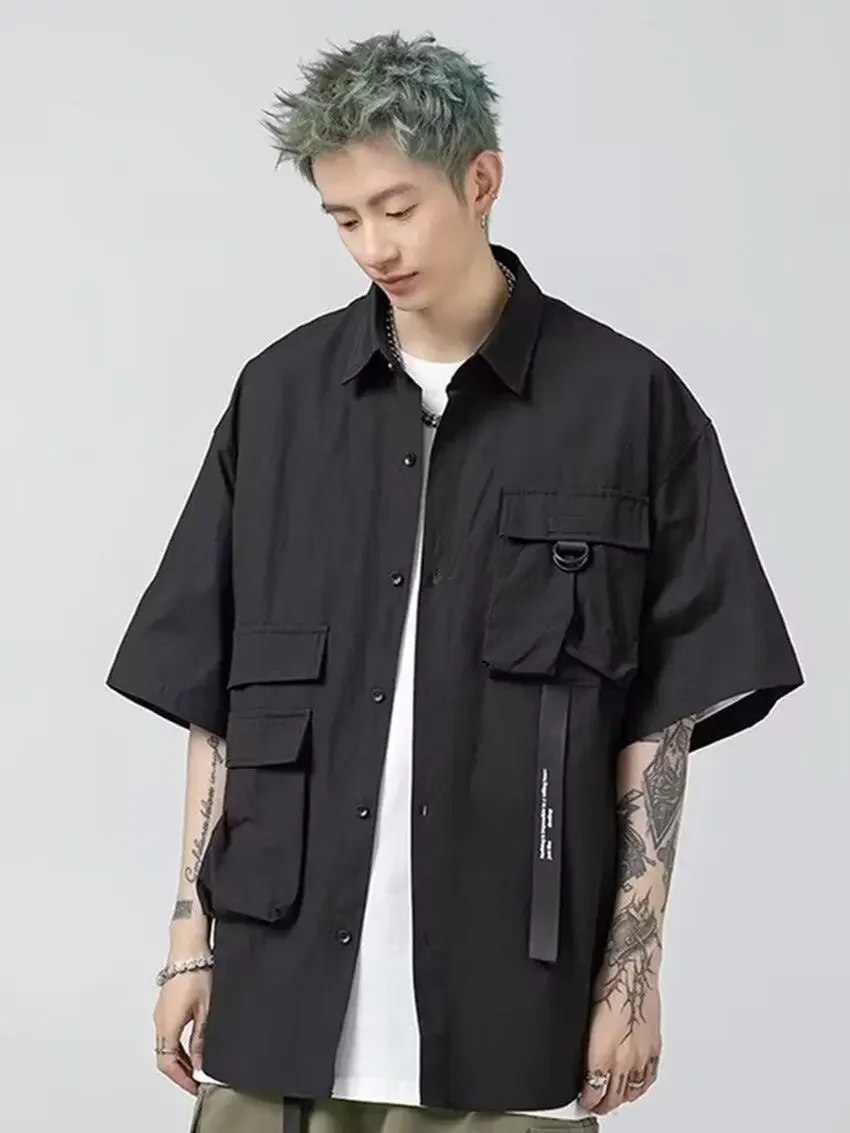 Stylish Y2k Men's Shirts Summer Korean Cargo Shirts for Men Black Multi-Pocket Hip Hop Men Clothing Punk Gothic Streetwear