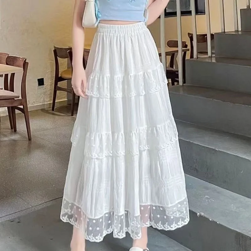 Summer Autumn Women Long Skirts Vintage High Waist Elastic Lace White Chic Long Cake A Line Skirt