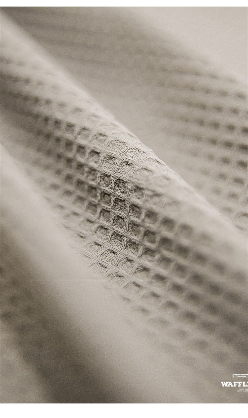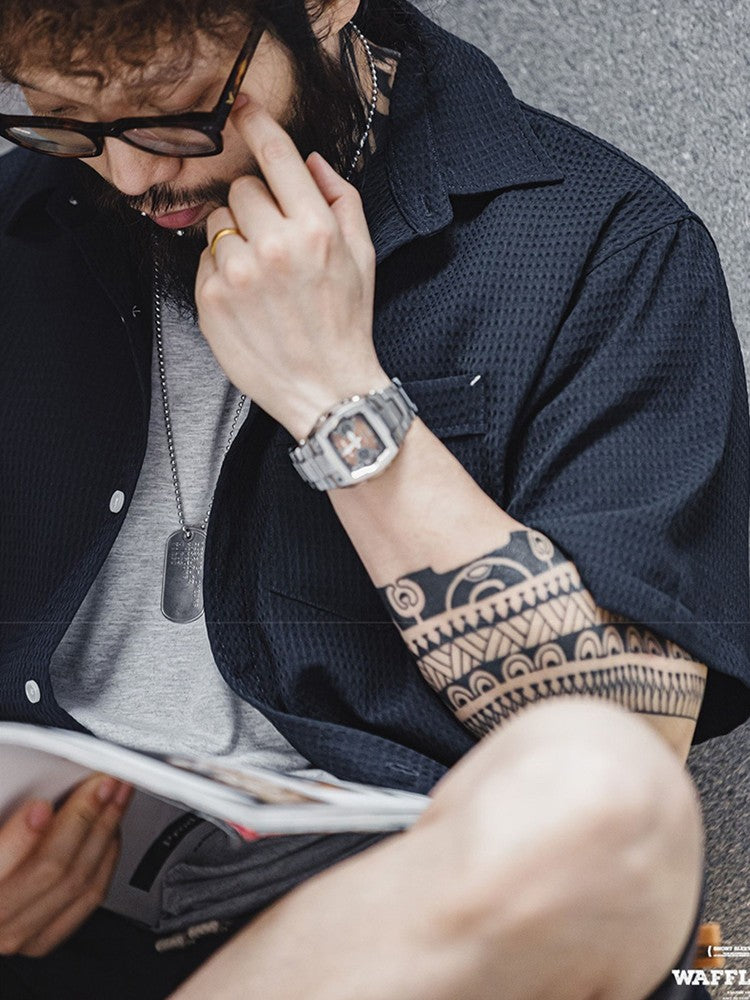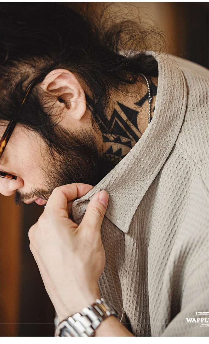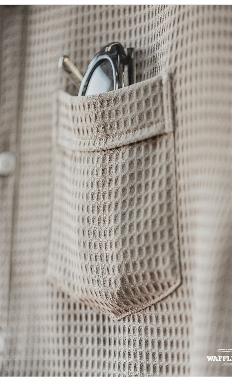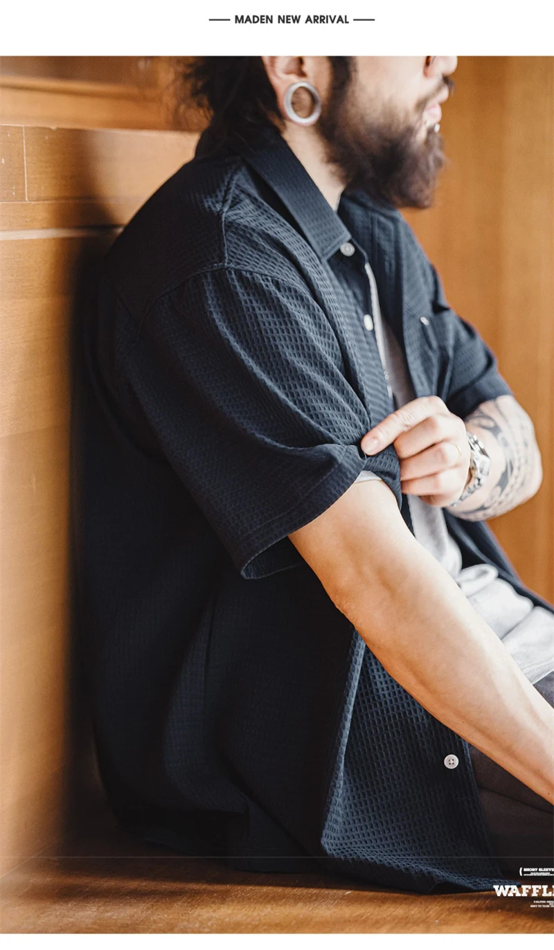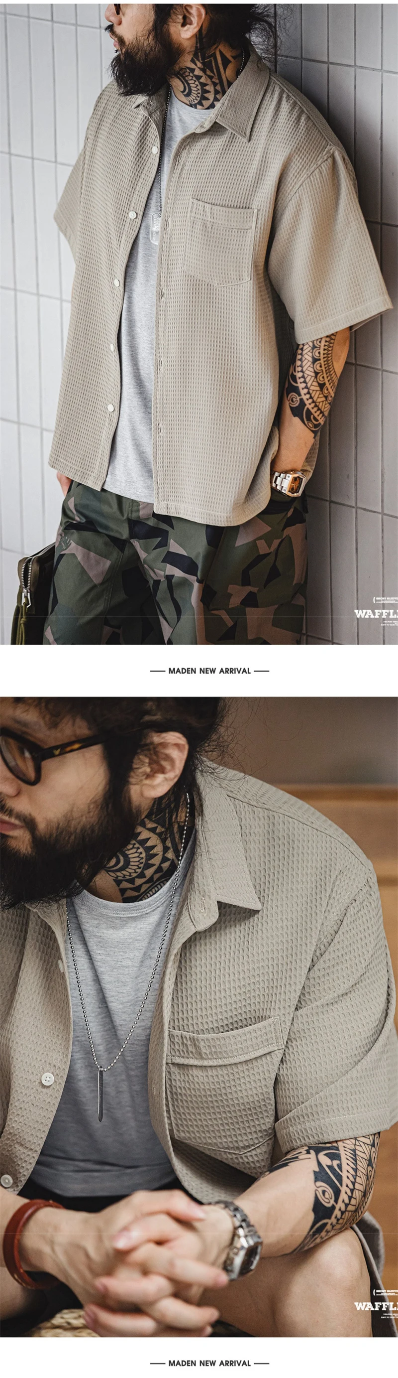 Summer Men's Waffle Short Sleeve Cargo Shirts 2025 New Casual Retro Breathable Lapel Blouse Y2K Vintage Streetwear Tee Shirt