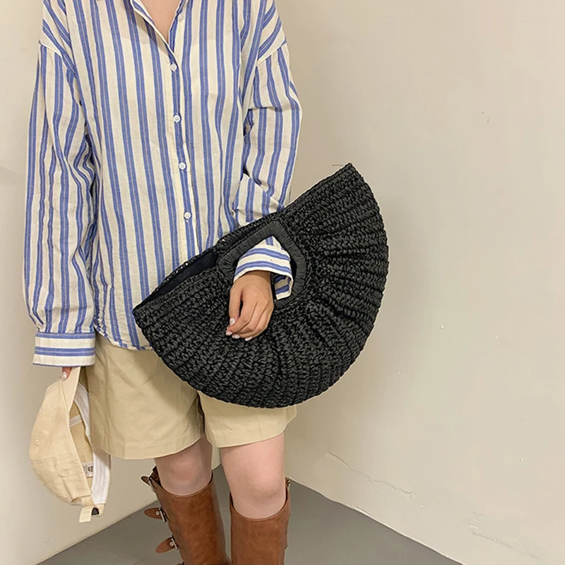 Summer Straw Women Half-moon Beach Handbag Rattan Handmade Handle Fashion Kintted Tote Bag