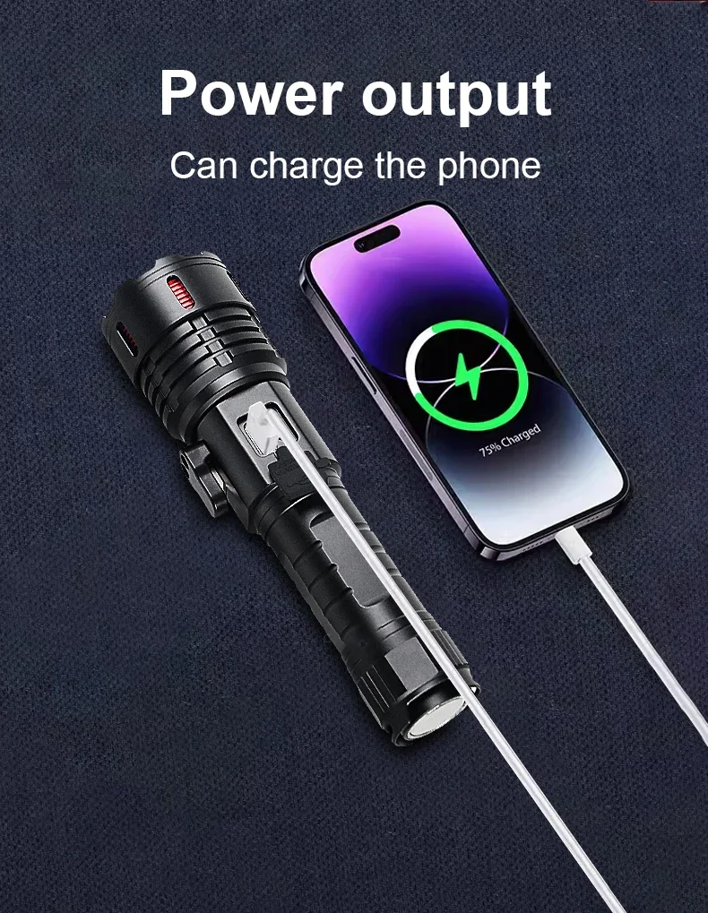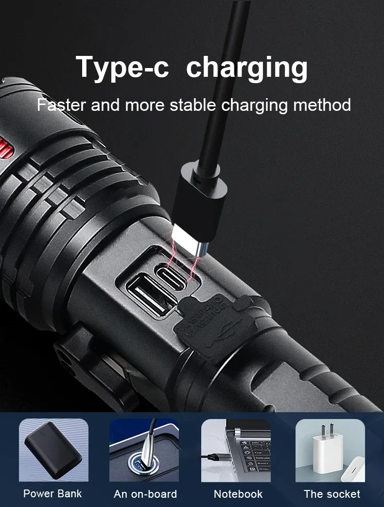 --Other features include convenient Type-C charging for fast and efficient charging, and a bottom magnet for hands-free operation. This allows you to easily secure the flashlight to a metal surface while working, providing unparalleled utility in a variety of situations.