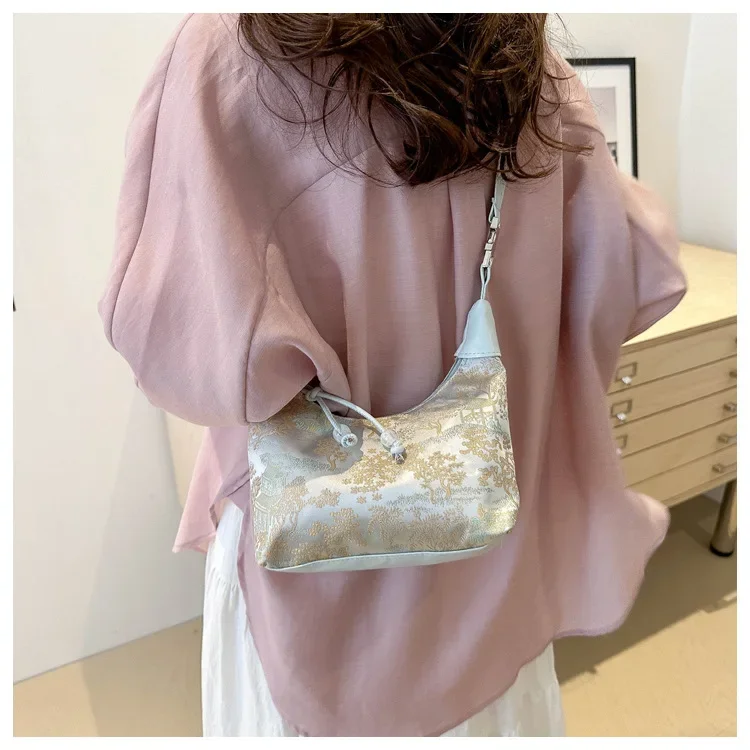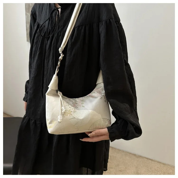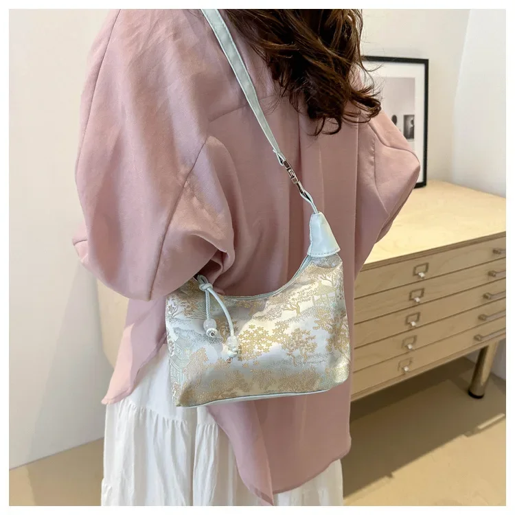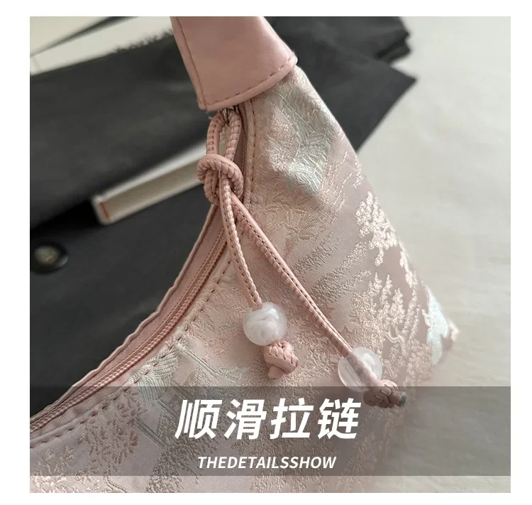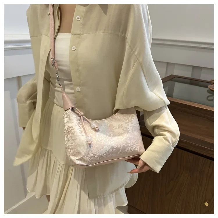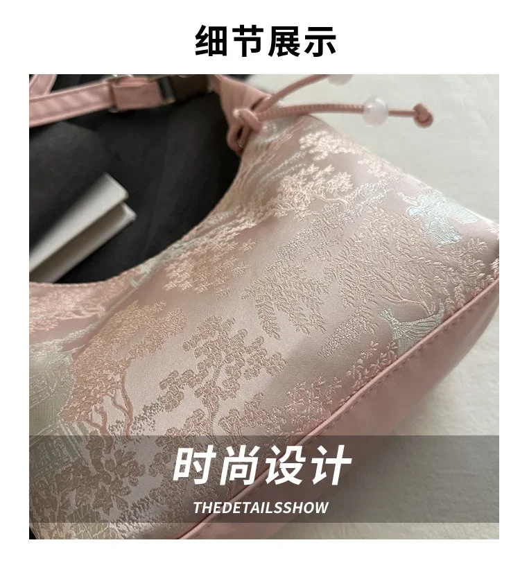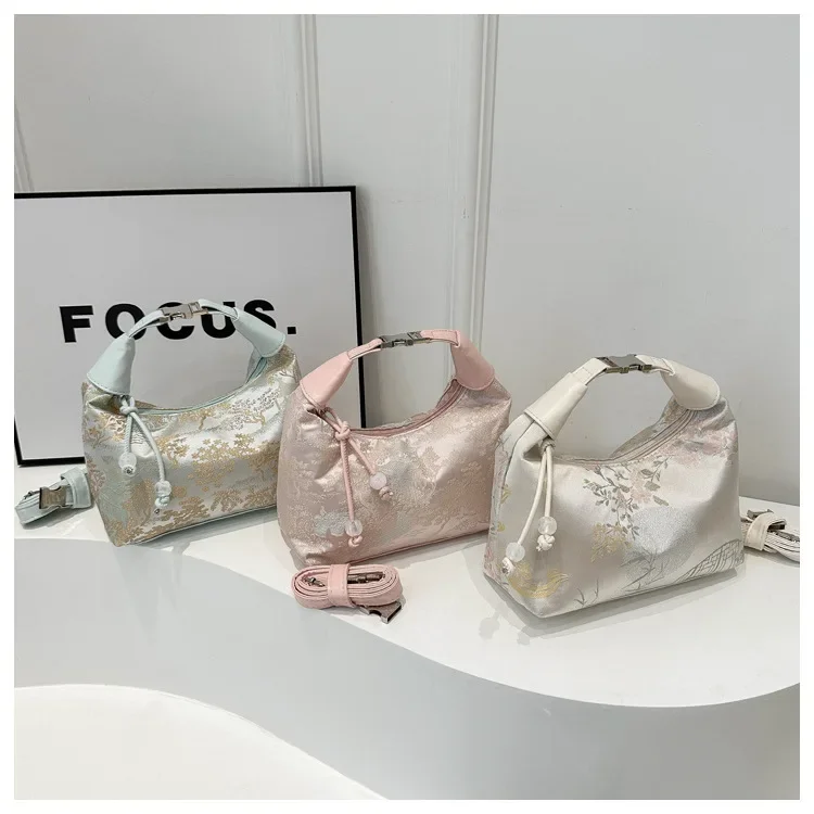 Sweet Embroidery Shoulder Bag Nylon Texture Pearl Pendant Crossbody Bag Small Bucket Handbag Women Canvas Luxury Cheongsam Bag