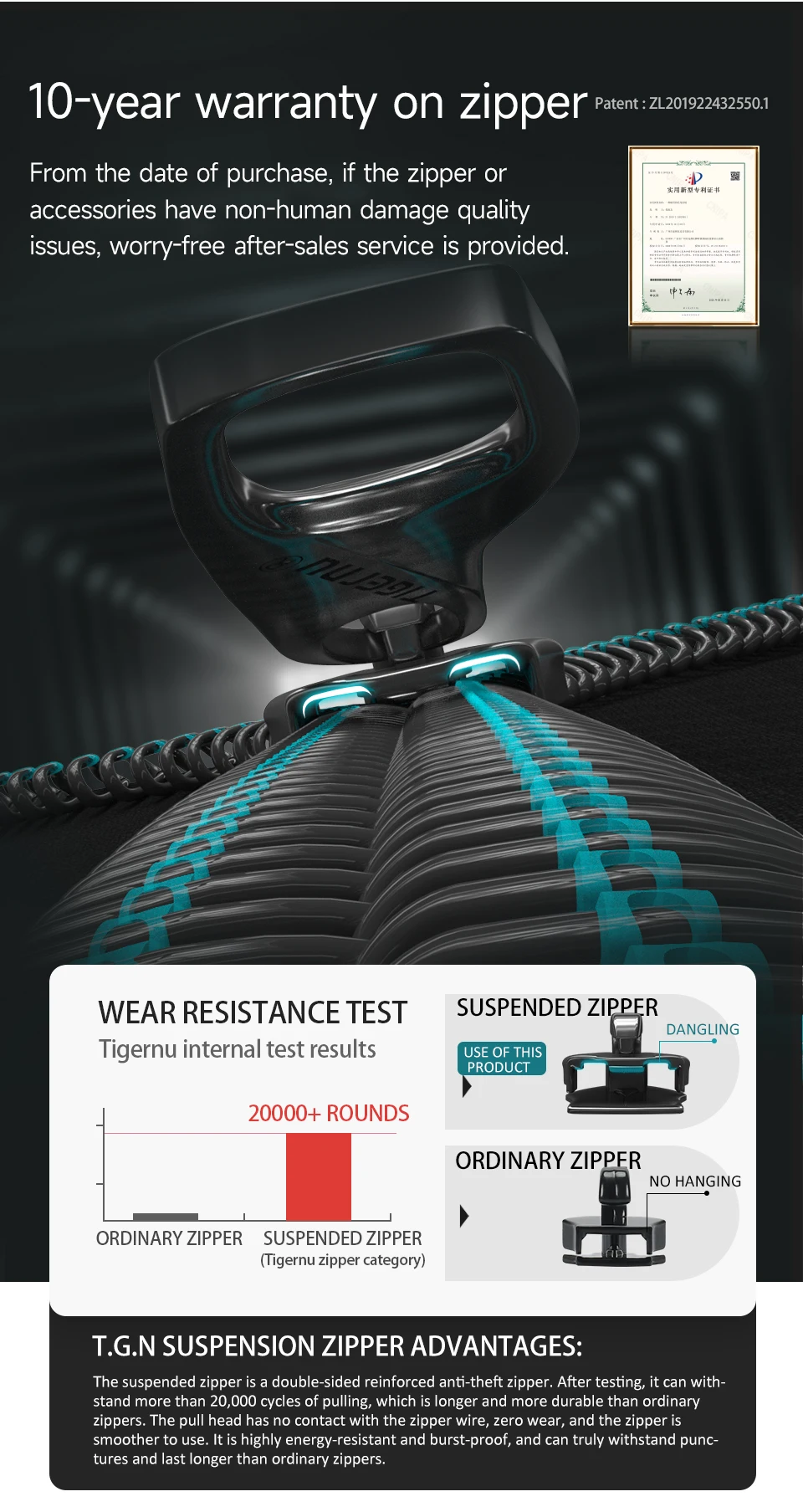 1. Brand patent innovative zipper, Suspended design zipper, 10-year warranty zipper, reduce friction, longer life time
