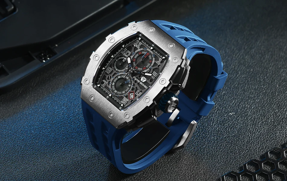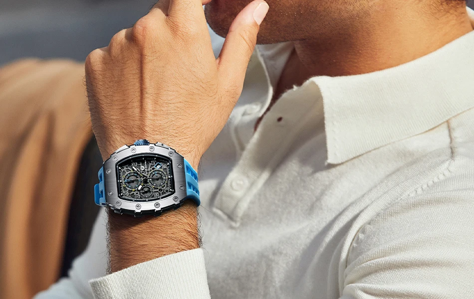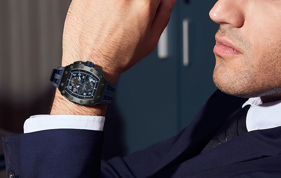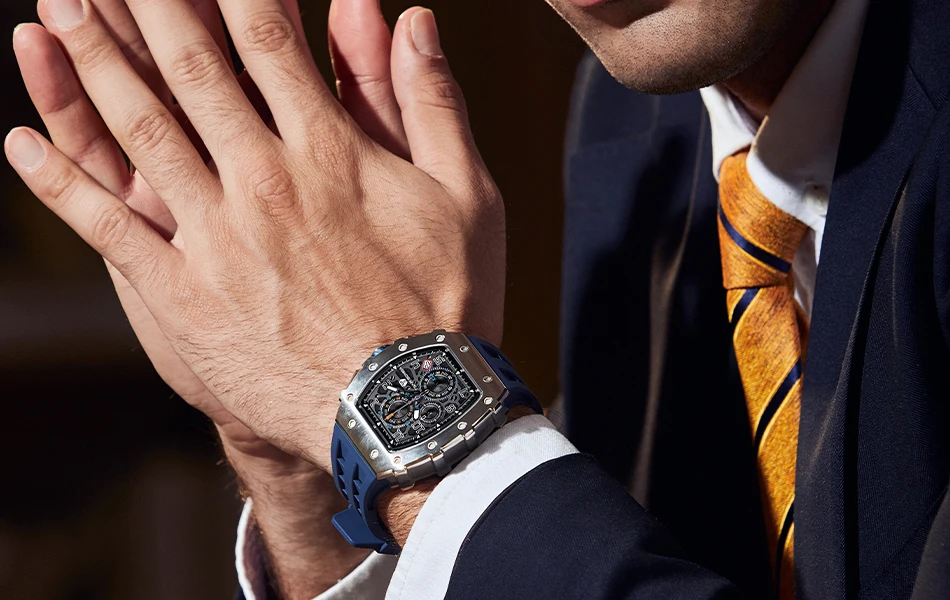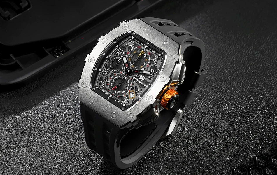 This men's sports and leisure watch is equipped with a military-grade rubber strap with 12 ventilation holes to keep your skin ventilated at all times.