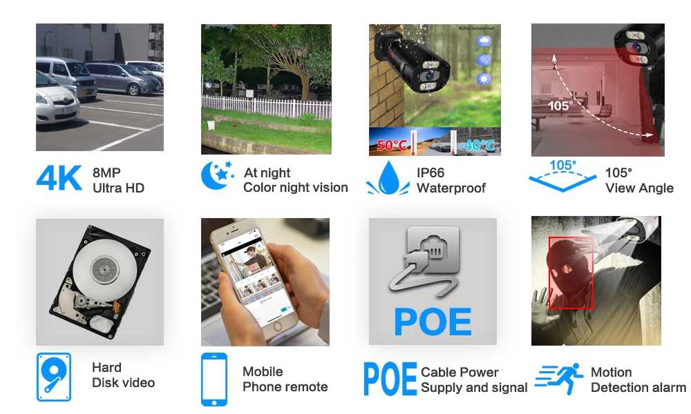 f you have multiple IP cameras or if you want 24/7 recording, a POE NVR is your best choice. The NVR works perfectly and efficiently with the cameras for round-the-clock monitoring and recording for your home & business security and surveillance.Support mobile phones, tablet computers, and multi-platform viewing.When you go outside,you needn't to worry about your property security. By using this cctv system,you can remote view live video simultaneously at anytime, anywhere with wifi/4G on smartphone/iPad/PC.Whenever a danger is detected, this surveillance camera will trigger alerts by immediately sending alert e-mails and pushing notifications to your device. You can create specific motion detecting zones to monitor certain areas as you want. You can adjust m