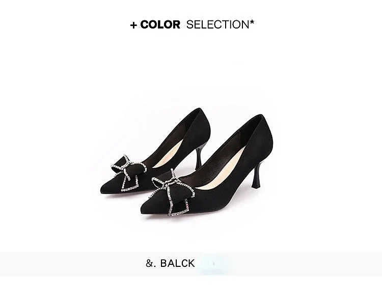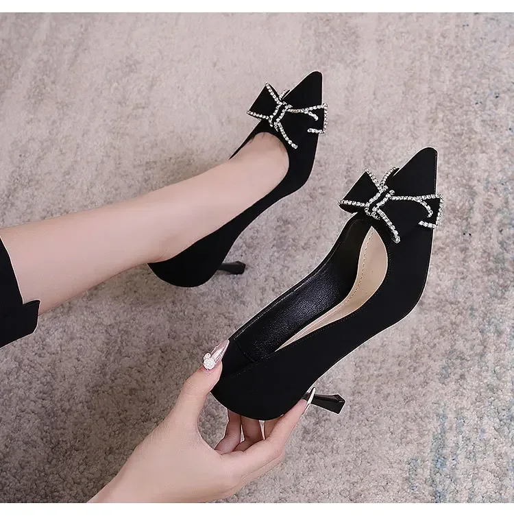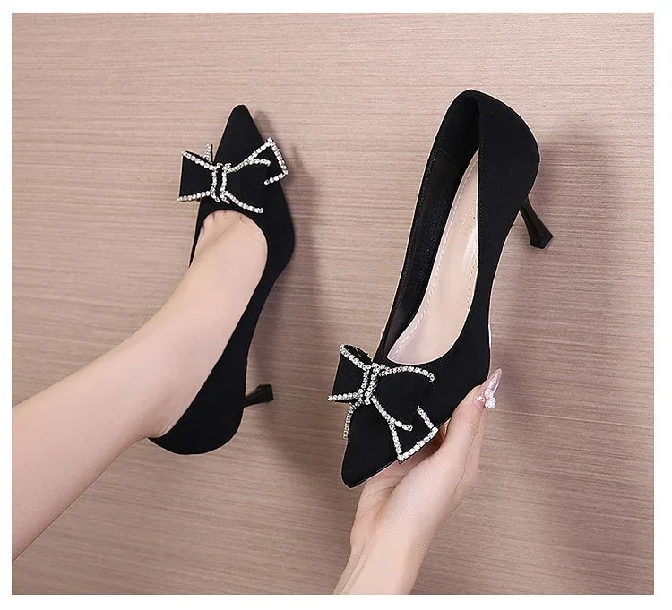 Versatile New Single Shoes Autumn and Winter Sexy Pointy Rhinestone Black Mature Women's Thin Heels High-heel Zapatos Mujer