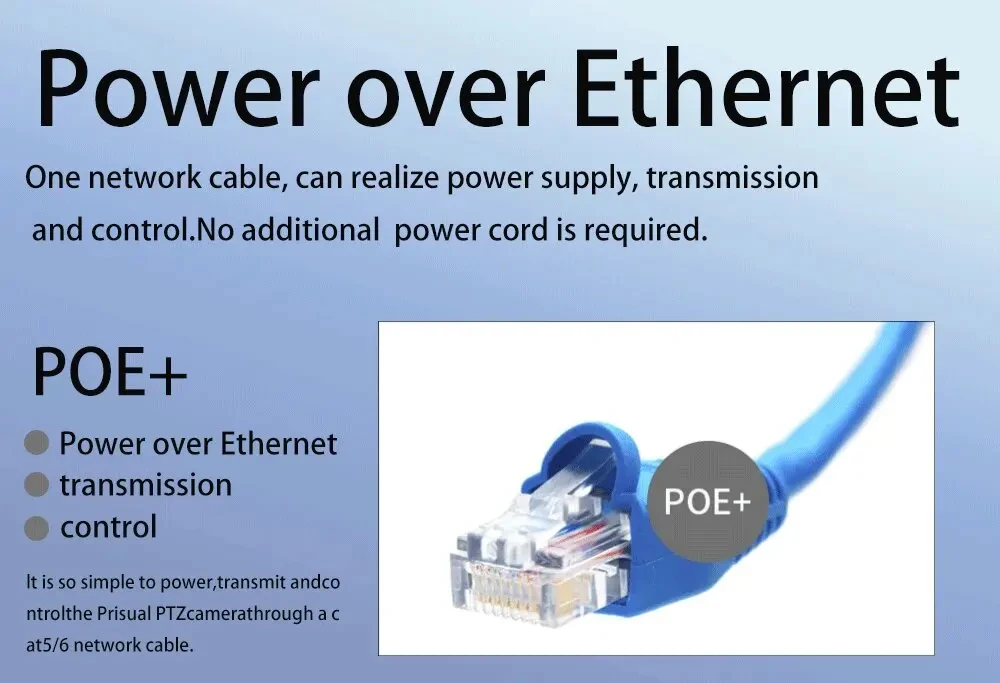 The PoE feature allows the camera to receive power and transmit data simultaneously through a single Ethernet cable, eliminating the hassle of laying additional power cords. However, it's important to note that when using alternative video sources like HDMI, USB, or SDI, a power adapter is required.