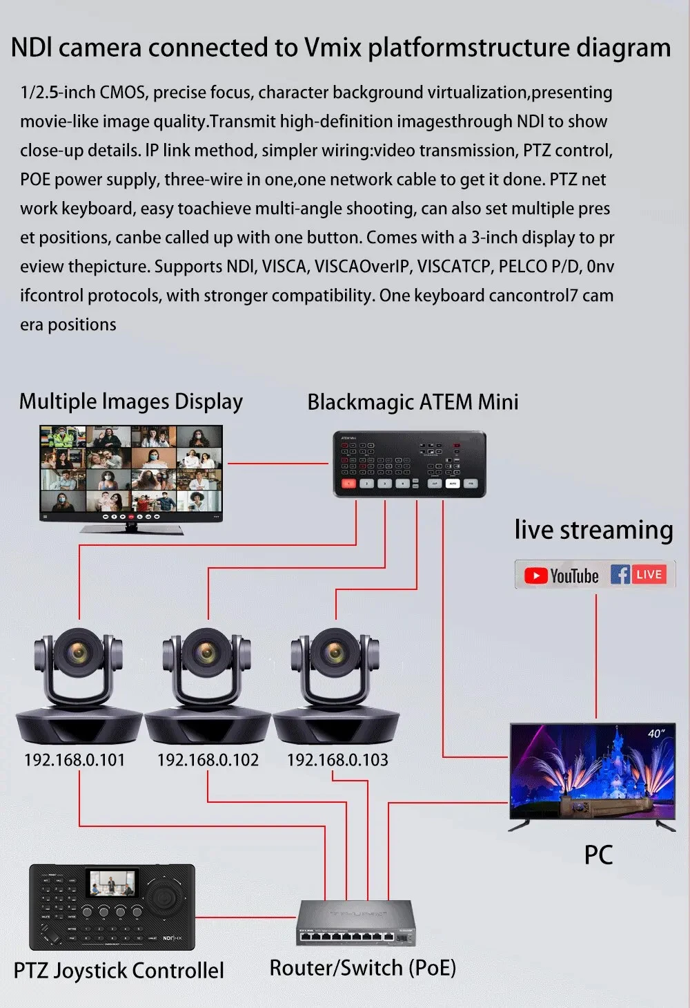 As a professional NDI PTZ camera endorsed by Newtek Inc., it incorporates advanced NDI technology and is PoE-enabled. With just a single Ethernet cable, it effortlessly manages power supply, audio transmission, control signals, and low-latency video streaming. Seamlessly integrating with leading video applications in the industry, including OBS, vMix, Livestream Studio, and Wirecast, it offers users a convenient and efficient video production solution.