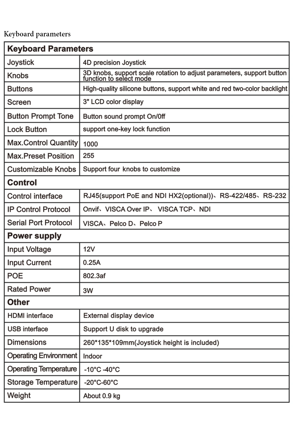 Users have the flexibility to control the camera through multiple interfaces, including RS232/485/RS422, network IP control, as well as industry-standard protocols like VISCA (including VISCA Over IP), PELCO P/D, and ONVIF, facilitating easy integration into different control systems.