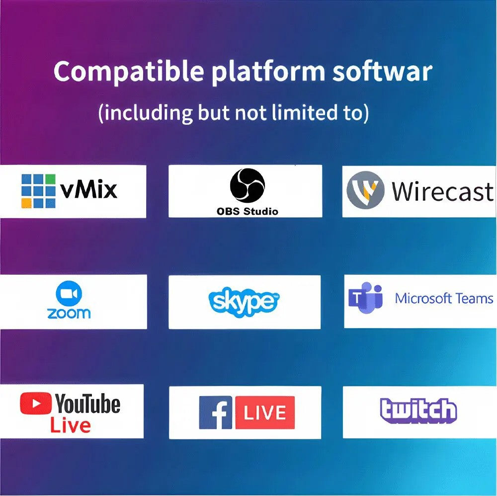 It is fully compatible with a wide array of popular video/conference software, such as Zoom, Skype, YouTube, Facebook Messenger, Teams, Facetime, Google Hangout, OBS, Google Meet, and more. Additionally, it supports various operating systems including Windows 7/8.1/10, Mac 10.10, Linux, Android, and higher versions, ensuring seamless integration into different digital ecosystems.