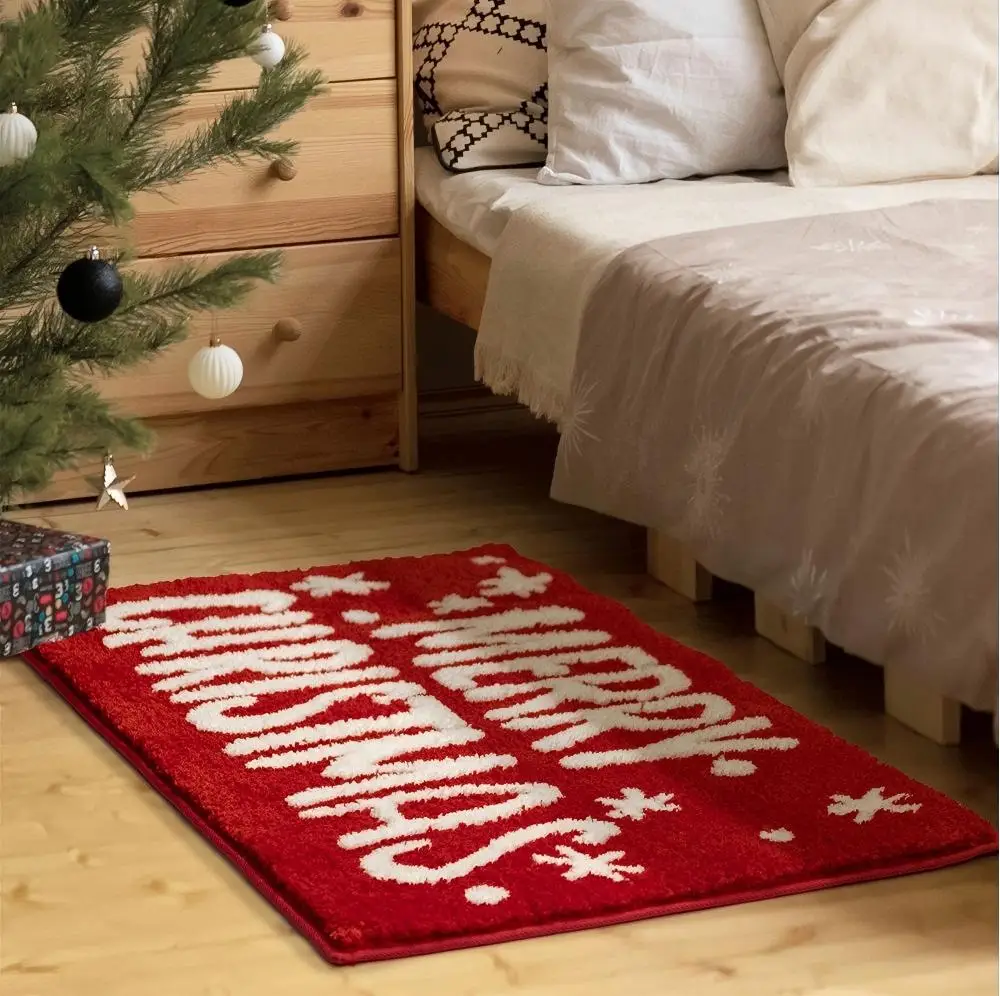 VIKAMA Red Christmas Living Room Decorative Carpet Anti-slip Fuzzy Bedside Rug for Bedroom Bathroom Floor Mat Home Decoration